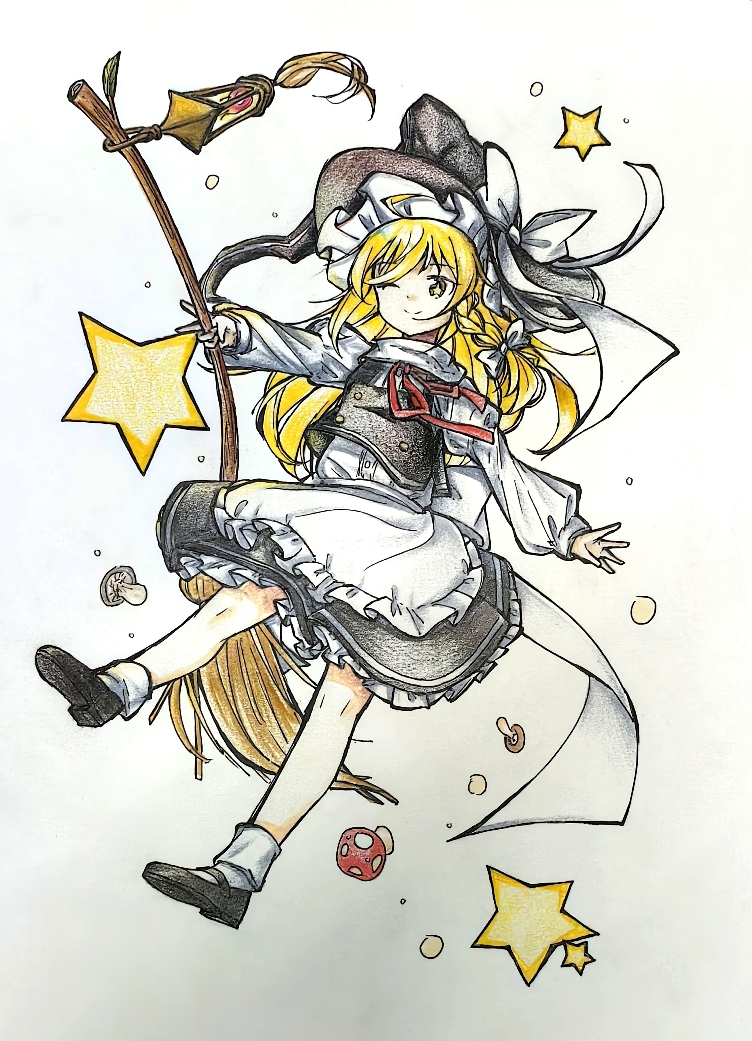 1girl apron black_hat black_shoes black_skirt black_vest blonde_hair bow braid broom closed_mouth commentary hair_bow hat hat_bow holding holding_broom kirisame_marisa lantern long_hair long_sleeves mary_janes mcnyan mushroom shoes side_braid single_braid skirt smile socks solo star_(symbol) touhou traditional_media vest waist_apron white_apron white_bow white_socks witch_hat yellow_eyes