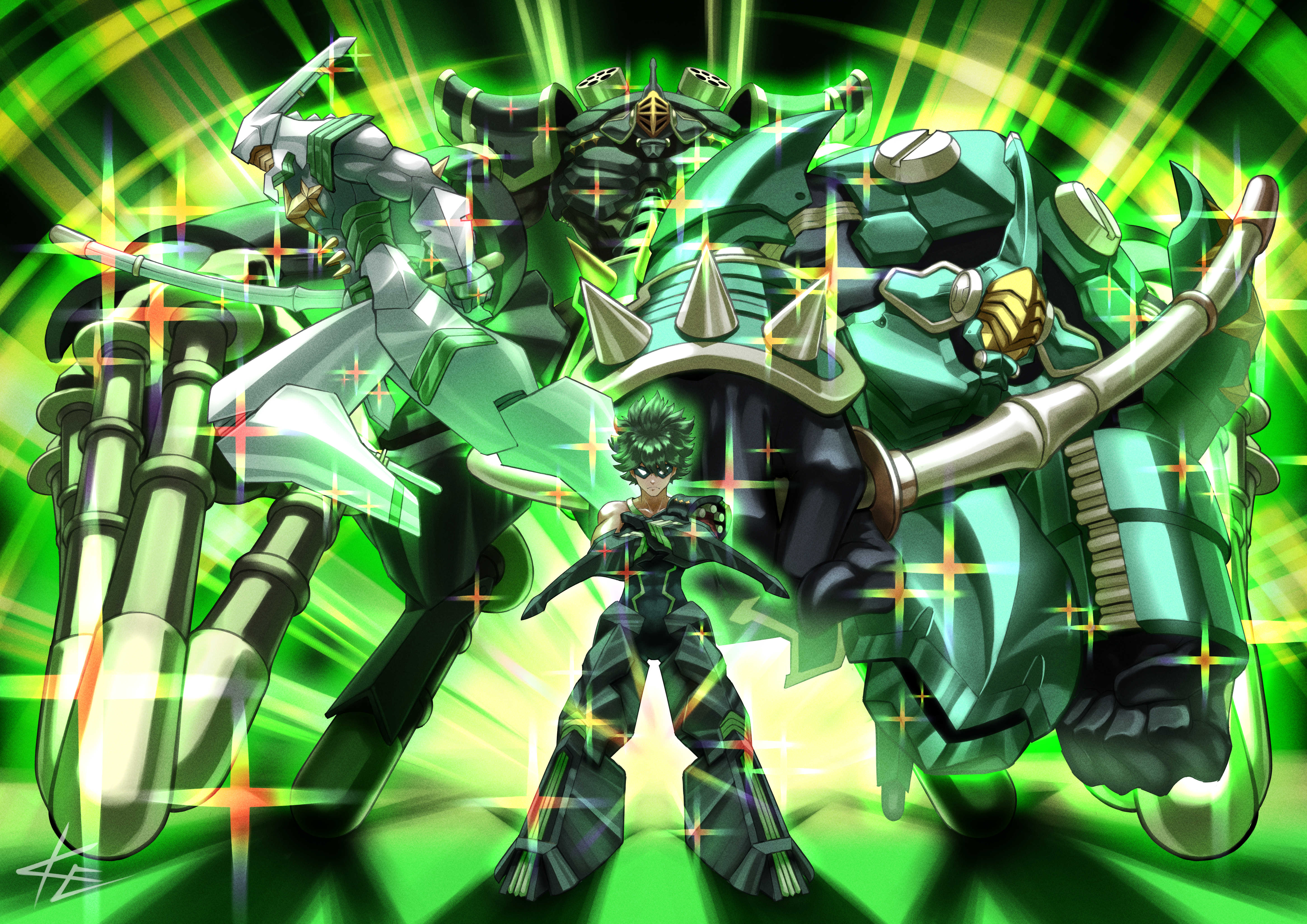 1boy 2023 absurdres adversarial_noise armor artist_name clenched_hands commentary crossed_arms dated_commentary domino_mask eye_mask full_body gauntlets glowing greaves green_hair green_outline green_theme helm helmet highres holding holding_sword holding_weapon kenosousaku kill_la_kill looking_at_viewer mask missile_pod official_alternate_costume outline sanageyama_uzu sanageyama_uzu_(blade_regalia) screw shinai shoulder_armor signature solo sparkle spiked_elbow_pads spikes standing sunburst sunburst_background sword weapon
