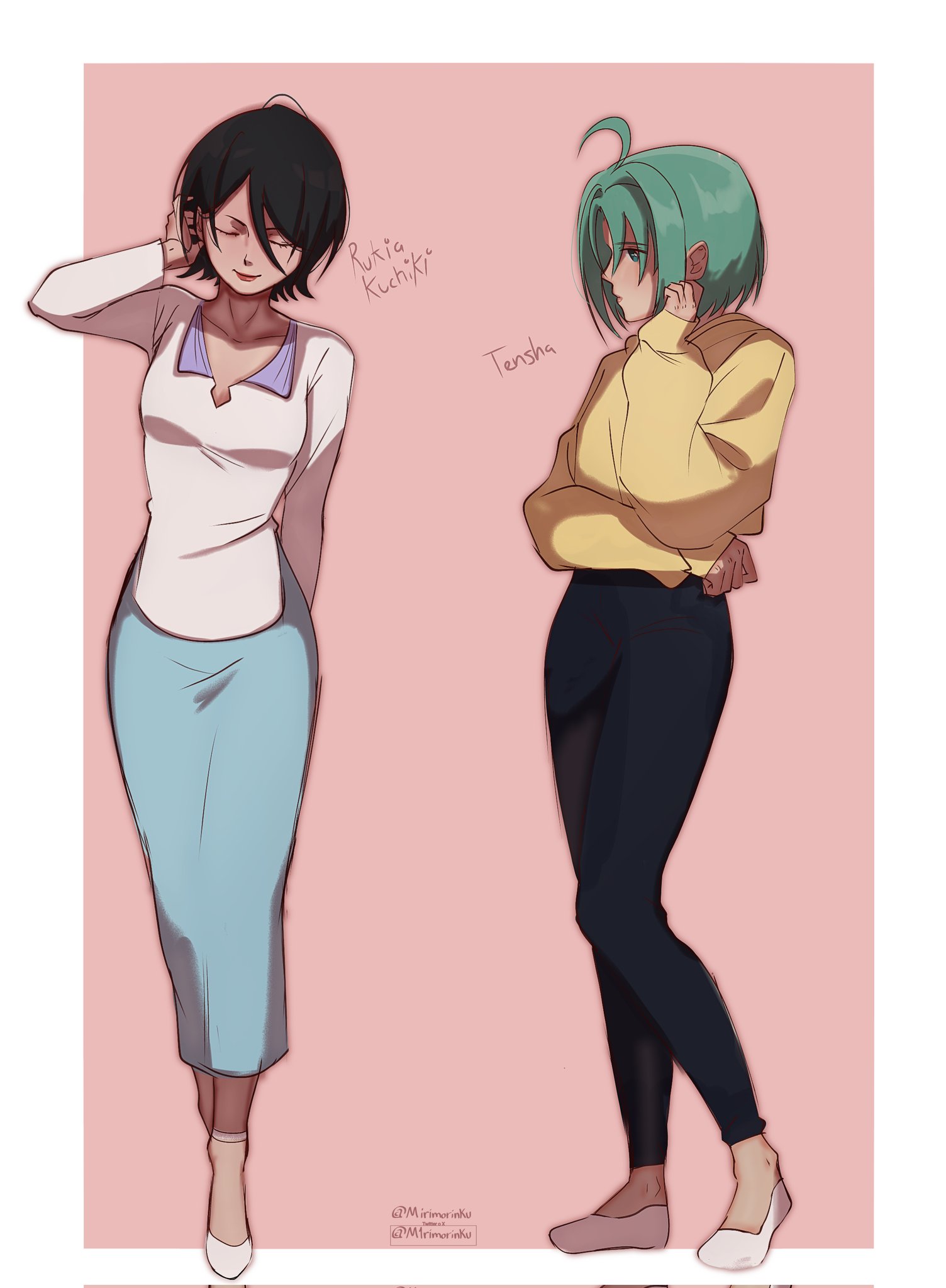 2girls ahoge black_hair black_pants bleach blue_skirt breasts commentary corrupted_twitter_file eyes_visible_through_hair green_eyes green_hair highres kuchiki_rukia long_skirt m1rimorinku multiple_girls original pants short_hair signature skirt sleeves_past_wrists small_breasts sweater yellow_sweater