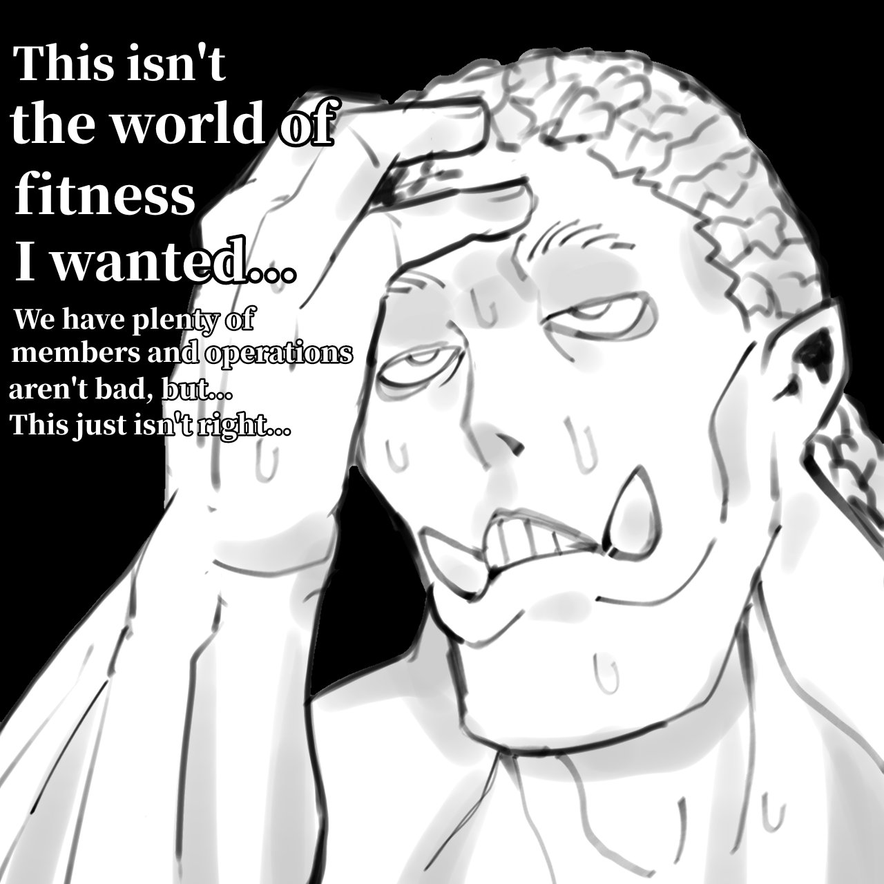 1boy black_background clenched_teeth close-up english_text hand_on_own_forehead highres monochrome muscular muscular_male nervous_sweating oligogi_meoggosipda orc original pointy_ears solo sweat teeth tusks