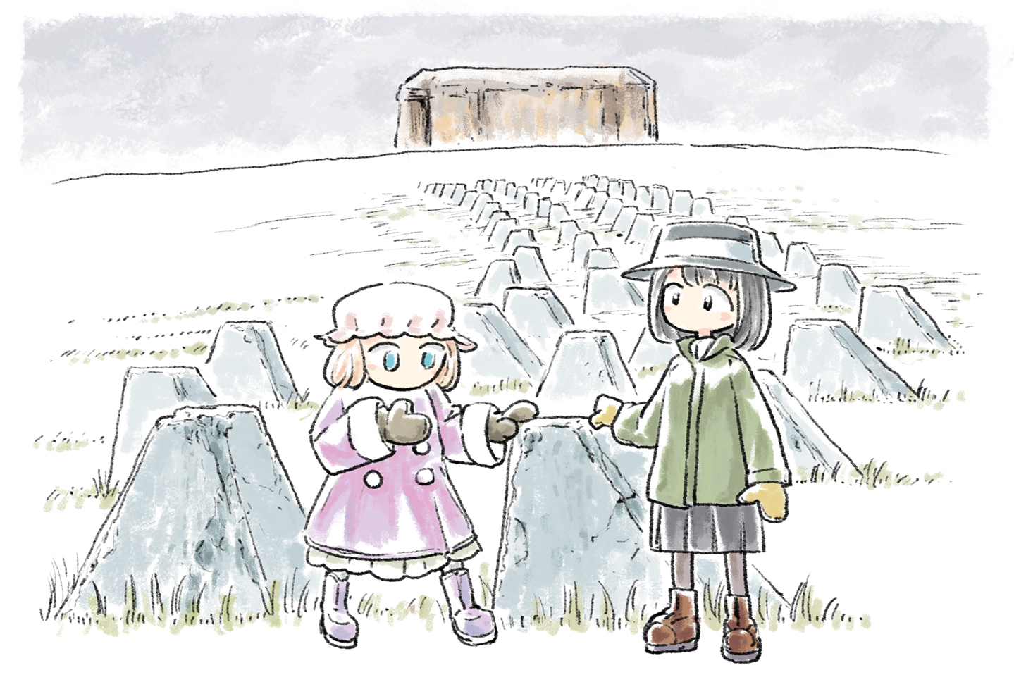 2girls black_eyes black_gloves black_hair black_hat black_pantyhose black_skirt blonde_hair blue_eyes blush_stickers boots brown_boots bunker check_commentary coat commentary_request frilled_skirt frills gloves green_coat hat long_sleeves maribel_hearn mob_cap multiple_girls no_mouth object_request pantyhose purple_coat short_hair skirt tataragawa_daini touhou usami_renko white_boots white_hat world_war_ii yellow_gloves