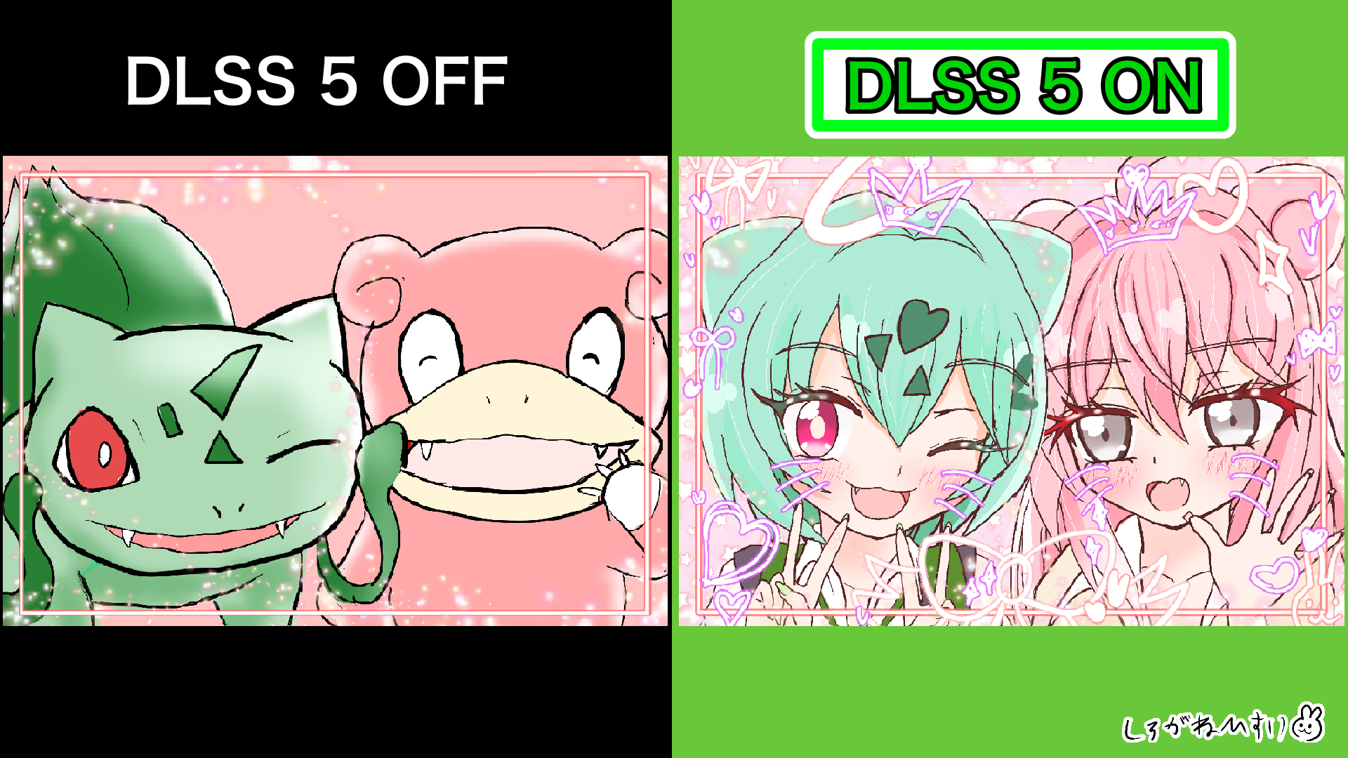 2girls ahoge animal_ears black_border border borrowed_character bulbasaur commentary_request dlss5_(meme) double_v drawn_bow drawn_crown drawn_heart drawn_whiskers english_text face_filter fang fingernails gen_1_pokemon green_border green_hair grey_eyes gyaru_bulbasaur gyaru_bulbasaur_(shin_no_tenpii) gyaru_slowpoke_(shin_no_tenpii) hair_between_eyes highres long_hair looking_at_viewer medium_hair meme multiple_girls nail_polish nintendo one_eye_closed open_mouth original parody pink_hair pokemon pokemon_(creature) sirogane_hisui slowpoke smile v