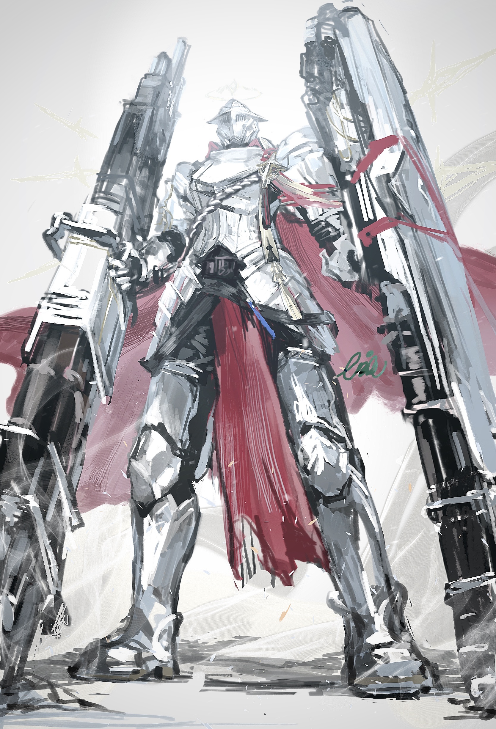 1boy absurdres arknights armor cape commentary_request facing_viewer from_below halo helmet highres holding holding_weapon male_focus nanataru10 red_cape sankta_miksaparato_(arknights) signature weapon white_background
