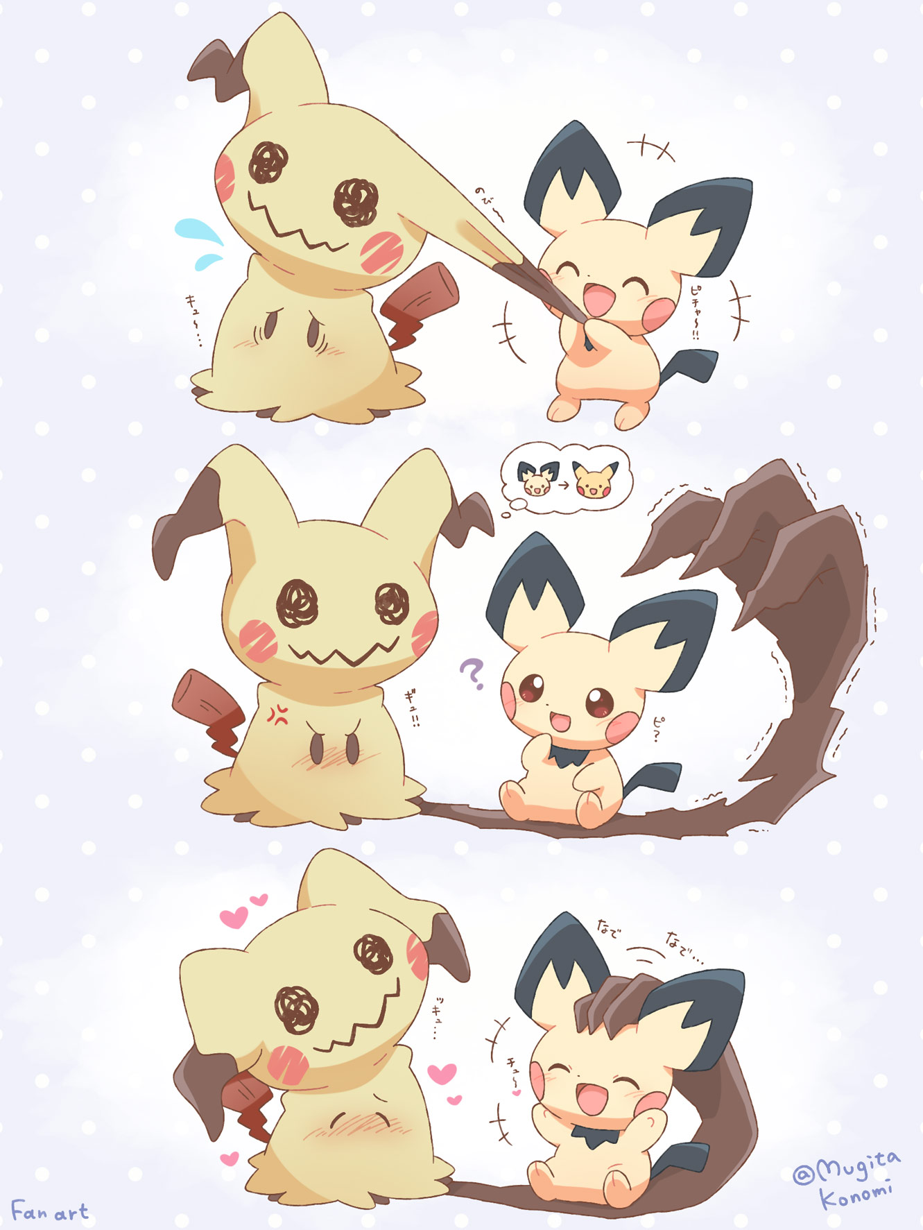 ? anger_vein blush claws closed_eyes commentary_request drawn_eyes flying_sweatdrops gen_2_pokemon gen_7_pokemon headpat heart highres mimikyu mugita_konomi nintendo no_humans open_mouth pichu pokemon pokemon_(creature) pokemon_focus pulling sitting smile solid_oval_eyes tail