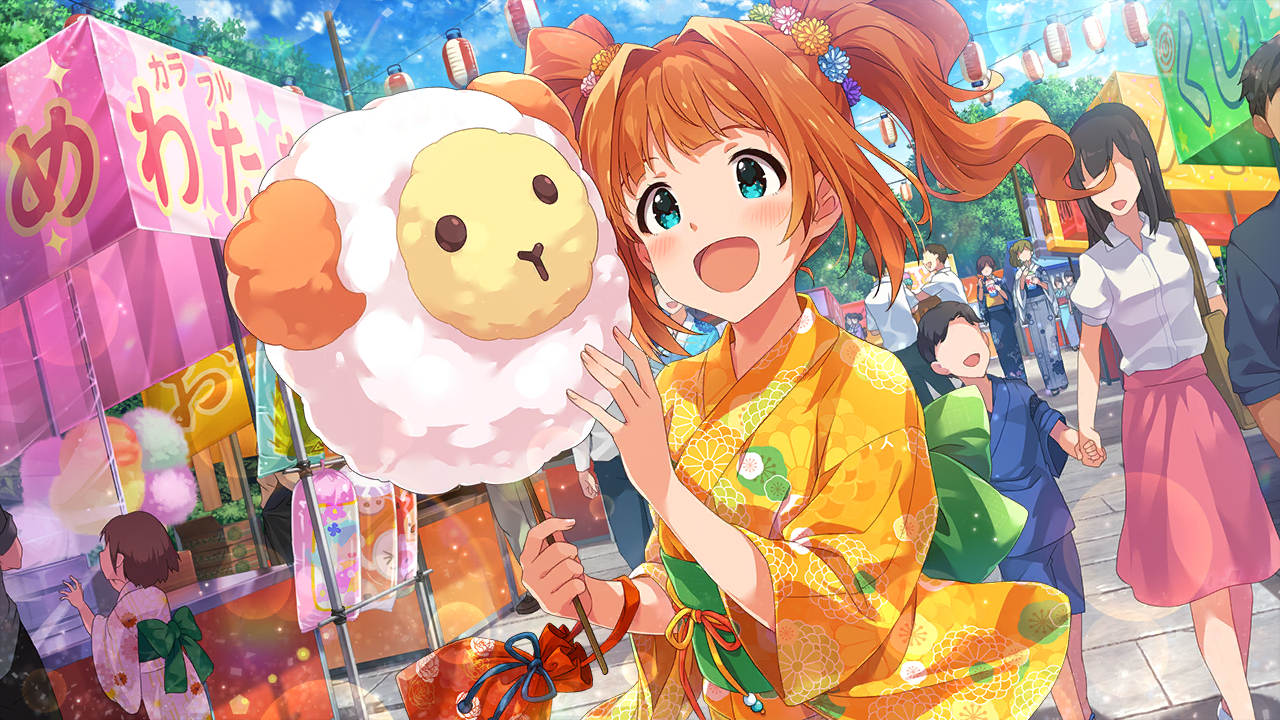 6+boys 6+girls :d blue_eyes blush card_commentary child commentary_request day faceless faceless_female faceless_male festival floral_print floral_print_kimono game_cg green_sash hair_intakes holding idolmaster idolmaster_(classic) idolmaster_million_live! idolmaster_million_live!_theater_days japanese_clothes kimono multiple_boys multiple_girls obi official_art open_mouth orange_hair orange_kimono outdoors print_kimono sash smile solo_focus standing takatsuki_yayoi third-party_source twintails