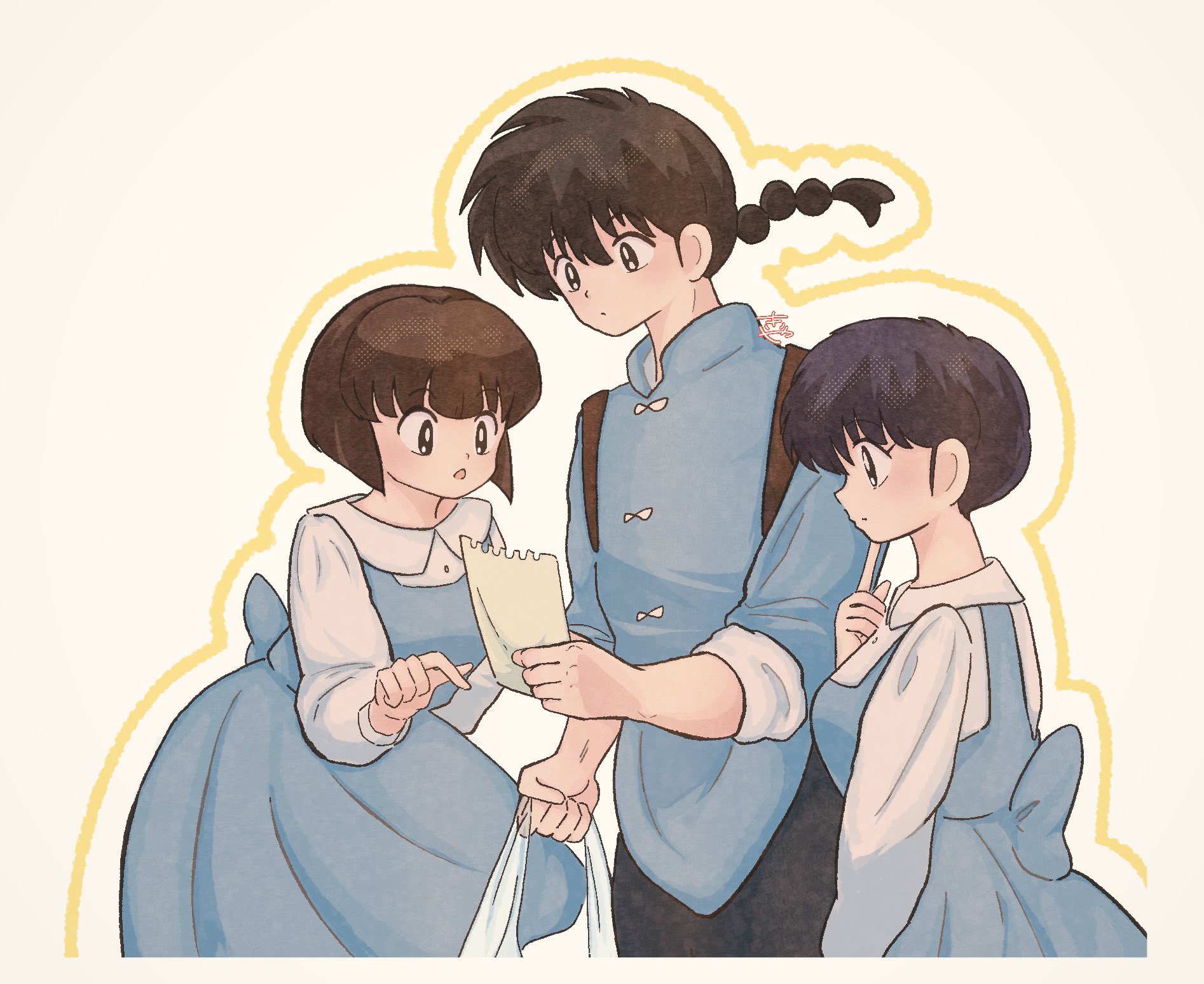 1boy 2girls :o black_eyes black_hair blue_dress braid brown_hair chinese_clothes closed_mouth commentary_request dress fuurinkan_high_school_uniform highres holding holding_paper moriya_erichish multiple_girls paper ranma_1/2 saotome_ranma school_uniform short_hair siblings single_braid sisters tendou_akane tendou_nabiki