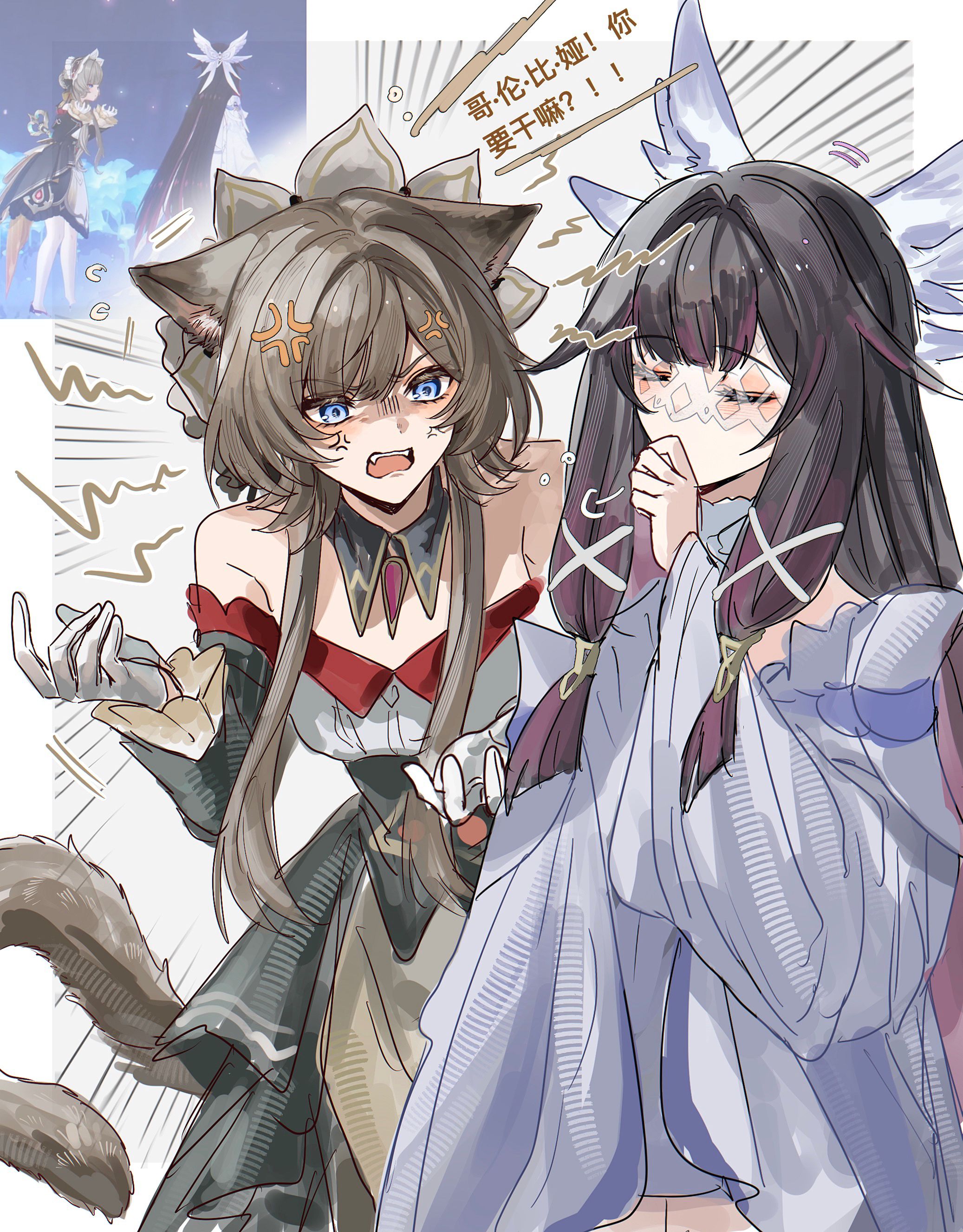 2girls absurdres anger_vein angry animal_ears bare_shoulders black_dress black_hair black_sleeves blue_eyes brown_hair cat_ears cat_girl cat_tail chinese_commentary chinese_text closed_eyes columbina_(genshin_impact) commentary_request detached_sleeves dress eye_mask feathered_wings game_screenshot_inset genshin_impact head_wings headdress highres long_hair mask multiple_girls open_mouth sandrone_(genshin_impact) screenshot_inset sidelocks tail white_dress white_wings wings zuo_daoxing