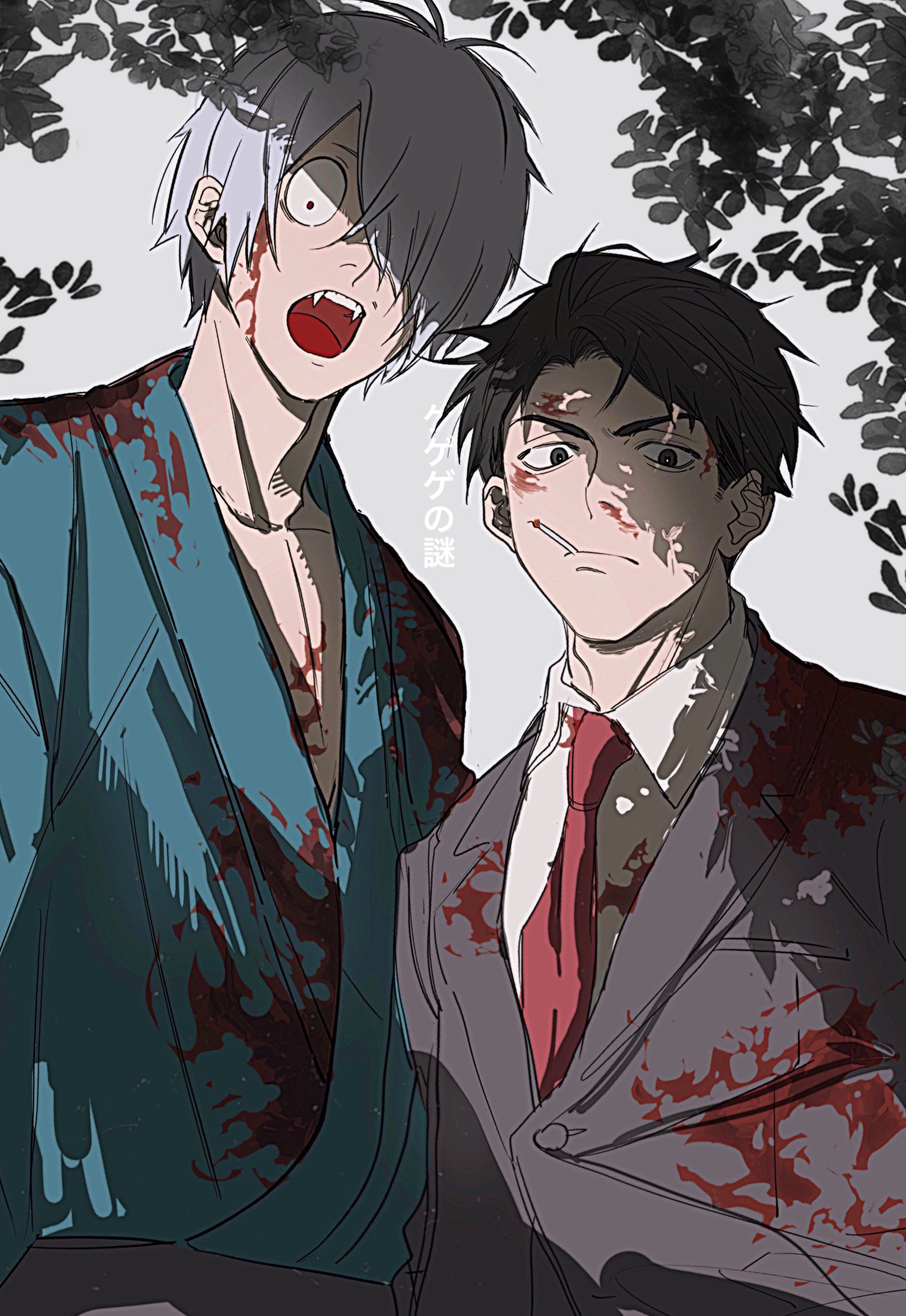 2boys absurdres black_hair blood blood_on_clothes blood_on_face bo_toike57 closed_mouth collared_shirt dot_pupils gegege_no_kitarou hair_over_one_eye height_difference highres jacket kitarou_tanjou:_gegege_no_nazo male_focus medama_oyaji_(human) mizuki_(gegege_no_kitarou) multiple_boys necktie open_mouth red_necktie shirt short_hair suit_jacket teeth translation_request white_shirt