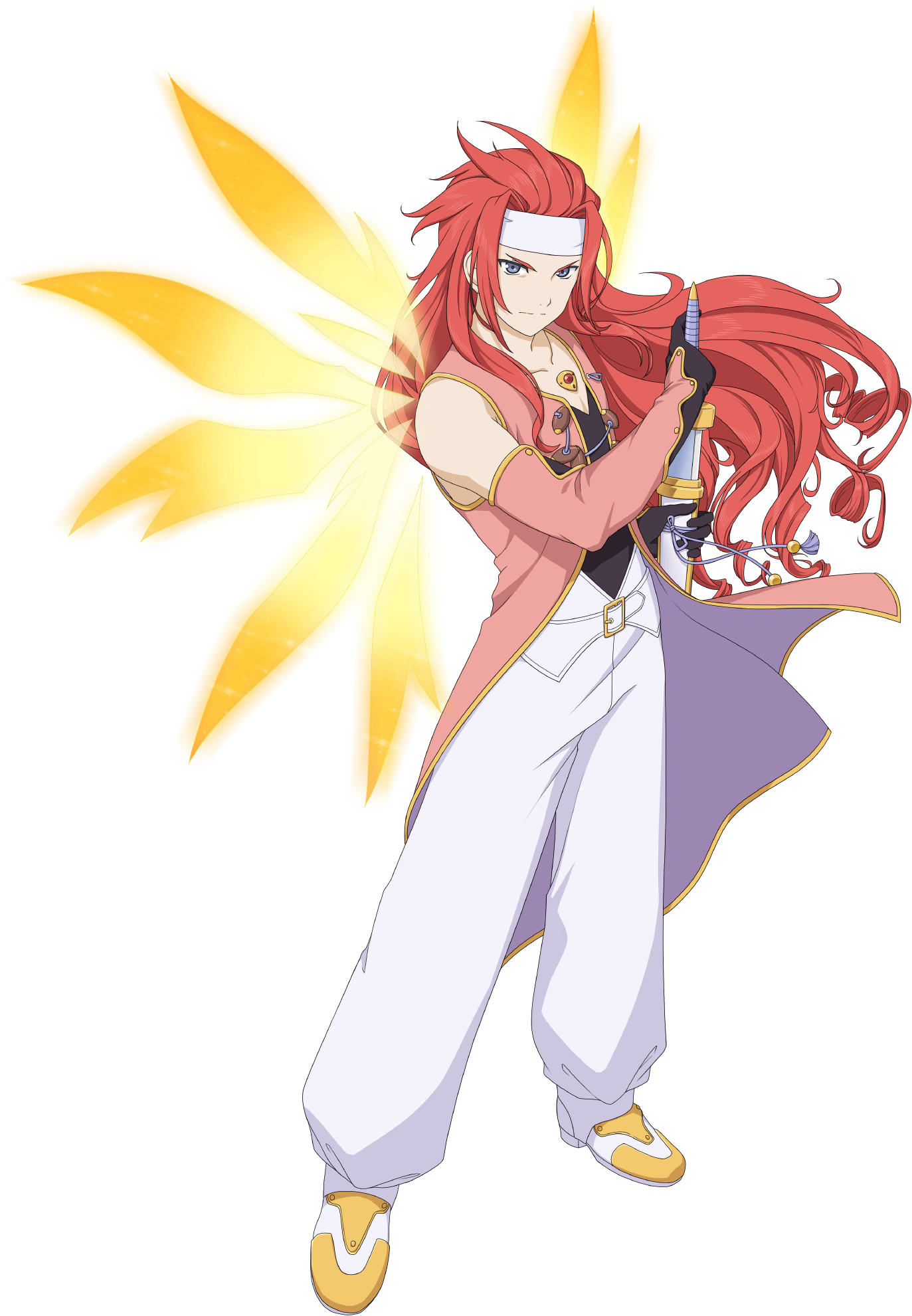 1boy artist_request black_gloves blue_eyes closed_mouth collarbone commentary cruxis_wings_(tales) elbow_gloves energy_wings game_cg gloves headband highres holding holding_sheath holding_sword holding_weapon long_hair looking_at_viewer male_focus multicolored_gloves official_art orange_wings pants pink_gloves pink_vest red_hair sheath sheathed shoes solo standing sword tales_of_(series) tales_of_asteria tales_of_symphonia third-party_source transparent_background two-tone_gloves unsheathing vest weapon white_headband white_pants white_shoes wings yellow_wings zelos_wilder