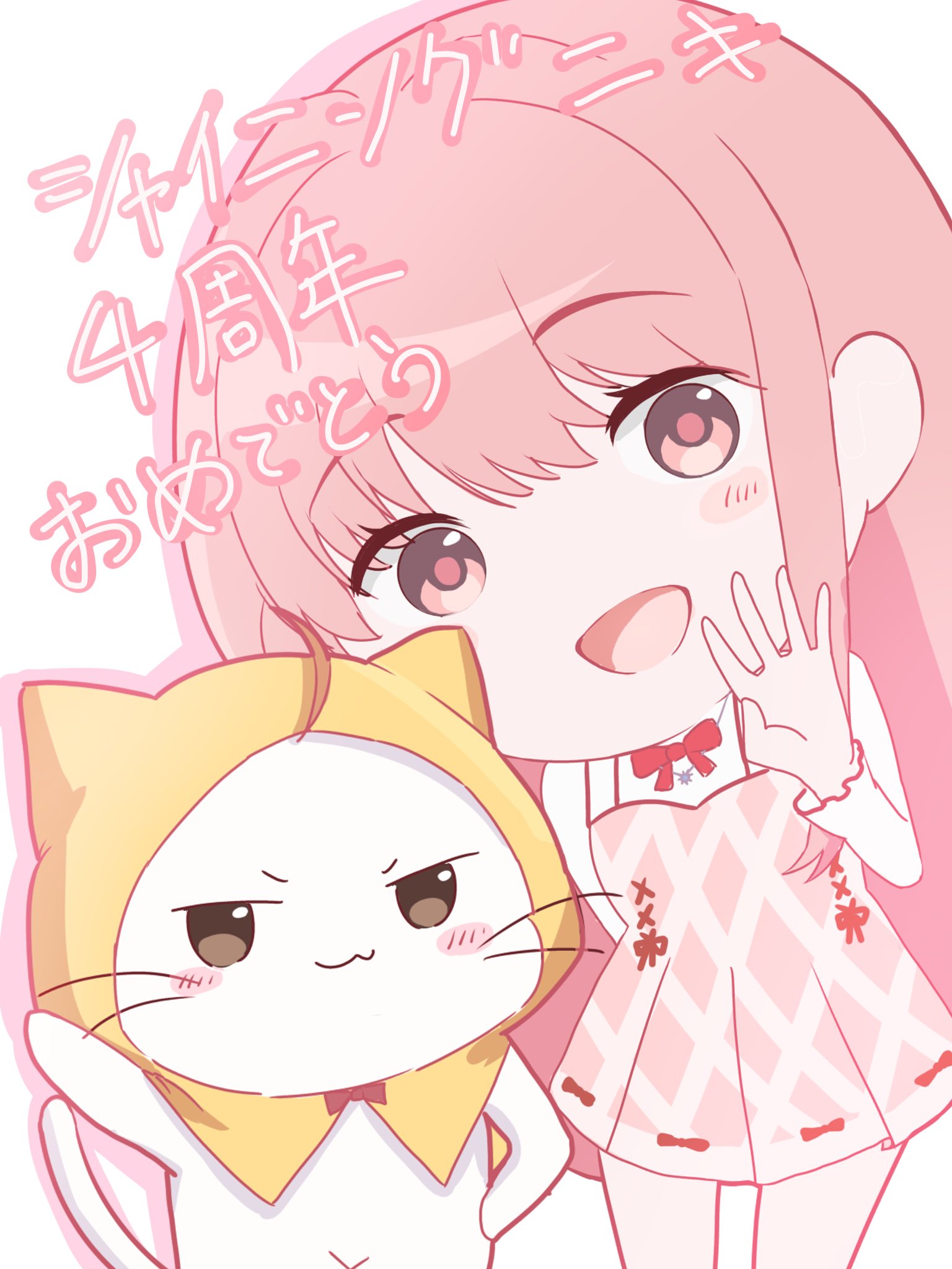 1girl :3 ahoge animal anniversary argyle_clothes argyle_dress bloom_poetry_(shining_nikki) blush_stickers bow bowtie brown_eyes cat chibi cloak closed_mouth clothed_animal commentary_request cross-laced_clothes cross-laced_dress dress dress_bow dress_ribbon drop_shadow ear_covers eyelashes feet_out_of_frame frilled_sleeves frills gozen_11ji hair_between_eyes hand_on_own_hip happy hexagram highres hood hood_up hooded_cloak infinity_nikki jewelry leaning_forward long_hair long_sleeves momo_(nikki) navel necklace nikki_(nikki) nikki_(series) open_mouth outstretched_arms pinafore_dress pink_dress pink_hair pleated_dress red_bow red_bowtie red_ribbon ribbon shirt short_dress sidelocks simple_background sleeveless sleeveless_dress smile standing star_(symbol) star_necklace straight_hair tareme traditional_bowtie translation_request very_long_hair waving whiskers white_background white_cat white_shirt yellow_cloak
