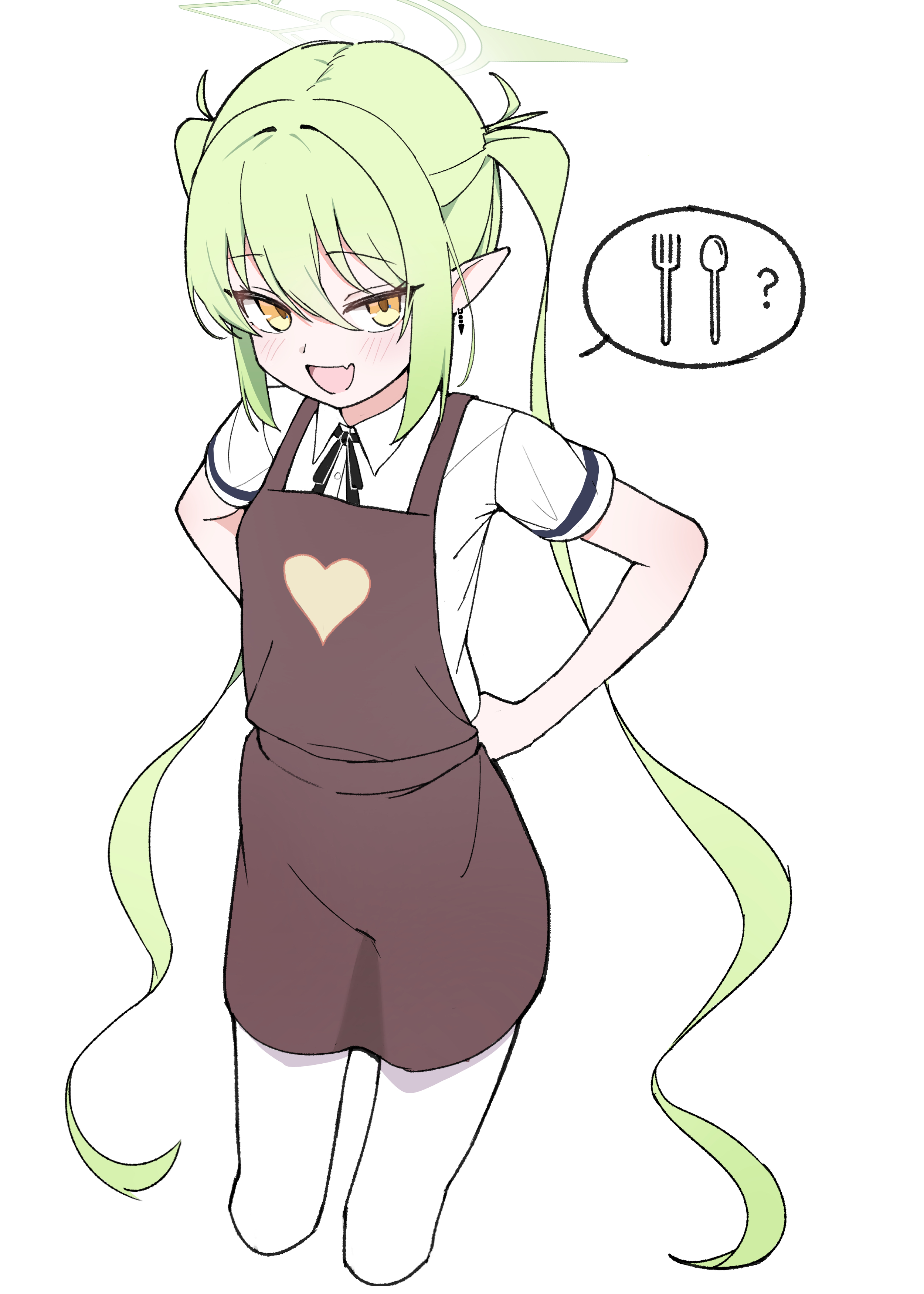 1girl ? absurdres alternate_costume apron arms_behind_back black_ribbon blue_archive blush brown_apron collared_shirt commentary commentary_request cowboy_shot earrings fang from_above green_hair green_halo hair_between_eyes halo heart heart_print highres jewelry long_hair looking_at_viewer neck_ribbon nozomi_(blue_archive) omokuri open_mouth pantyhose pointy_ears ribbon shirt short_sleeves sidelocks simple_background skin_fang smile smug solo speech_bubble tongue twintails very_long_hair white_background white_pantyhose yellow_eyes