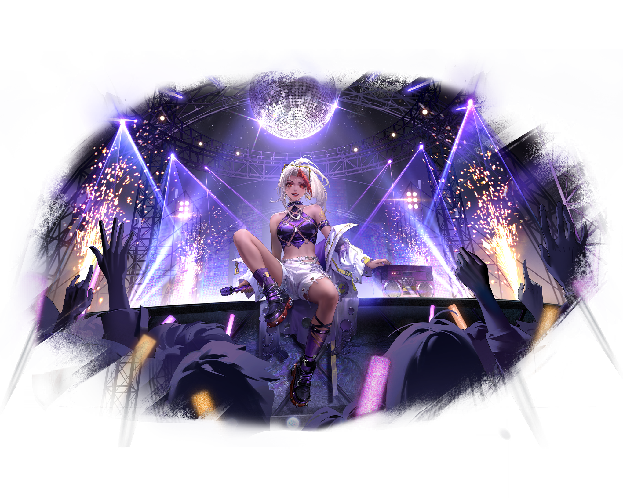 1girl \m/ armband artist_request asymmetrical_footwear boombox choker concert dark-skinned_female dark_skin disco_ball eyewear_on_head glowstick highres holding holding_glowstick holding_microphone jacket microphone multicolored_hair o-ring o-ring_top off_shoulder official_alternate_costume official_art orange_eyes path_to_nowhere peggy_(path_to_nowhere) purple_armband red_streaks shorts sleeveless spiked_boots spiked_choker spikes spotlight streaked_hair white_hair white_jacket white_shorts