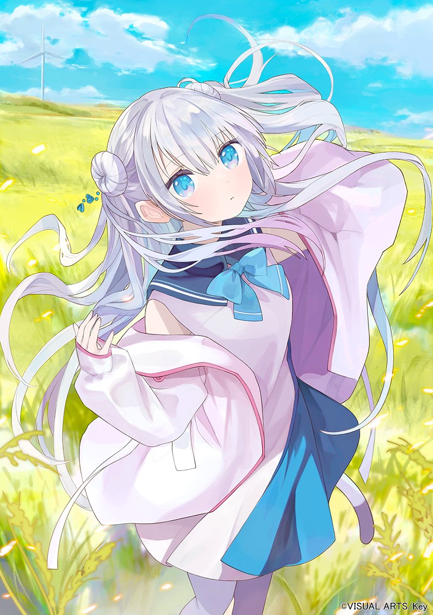1girl anemoi bare_shoulders blue_bow blue_bowtie blue_dress blue_eyes blue_sky blush bow bowtie cloud commentary_request copyright_notice cowboy_shot day double_bun dress eyes_visible_through_hair floating_hair grey_hair hair_between_eyes hair_bun hair_ornament hands_up highres jacket jacket_partially_removed long_hair looking_at_viewer multicolored_eyes open_clothes open_jacket outdoors parted_lips pink_eyes school_uniform second-party_source short_dress sky sleeves_past_wrists solo thighhighs tokiwata_soul tsujikura_spica two-tone_dress two-tone_eyes very_long_hair wheat wheat_field white_dress white_jacket white_thighhighs wind windmill
