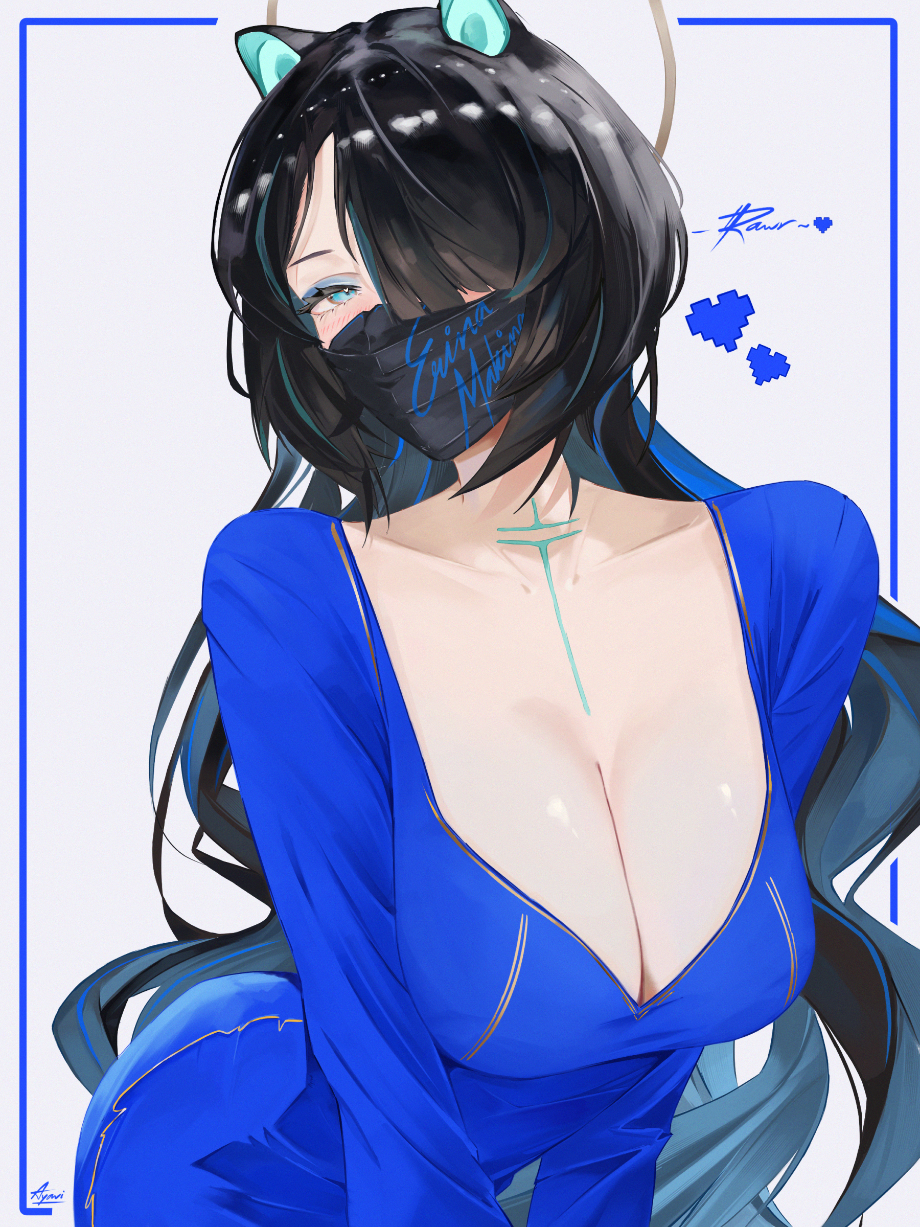 animal_ears ayavi black_hair blue_dress blue_eyes blue_hair breasts cleavage dress erina_makina hair_over_one_eye halo large_breasts long_hair mask phase_connect tagme tiger_ears virtual_youtuber