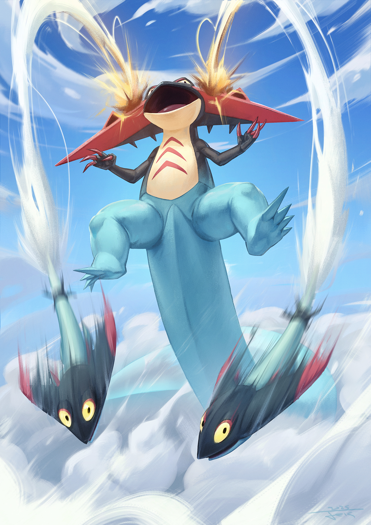 above_clouds blue_sky cloud commentary day dragapult dragon_darts_(pokemon) dreepy english_commentary feig_art firing flying full_body gen_8_pokemon highres motion_blur nintendo no_humans open_mouth pokemon pokemon_(creature) pokemon_focus pokemon_move sky