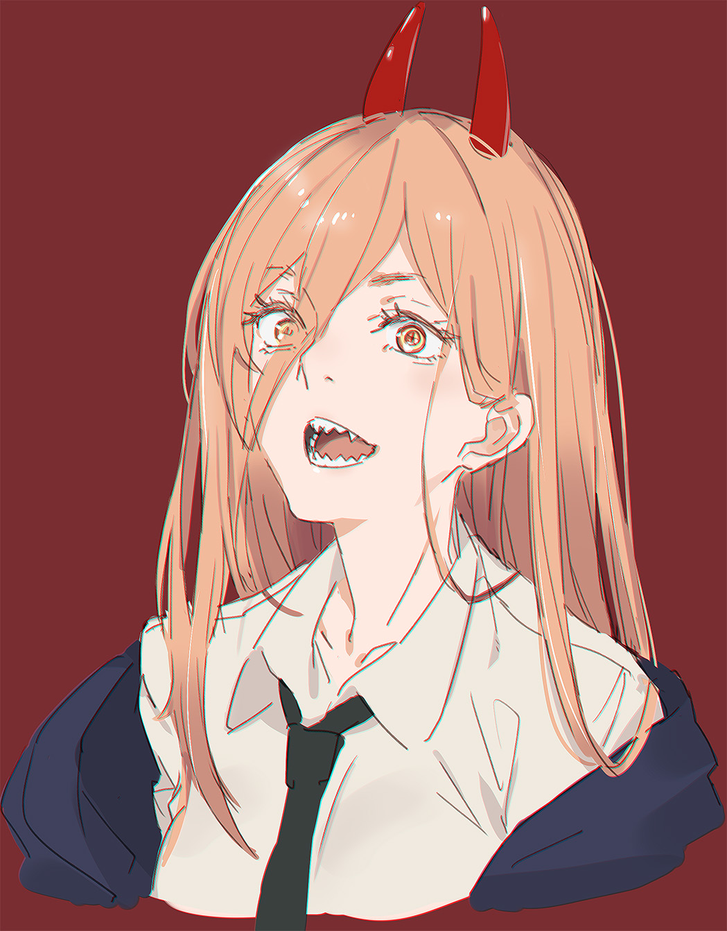1girl black_necktie chainsaw_man collared_shirt commentary_request cropped_arms cropped_torso hair_between_eyes highres horns jacket jacket_partially_removed kawata_hisashi looking_at_viewer loose_necktie necktie open_mouth power_(chainsaw_man) red_background sharp_teeth shirt simple_background solo symbol-shaped_pupils teeth white_shirt