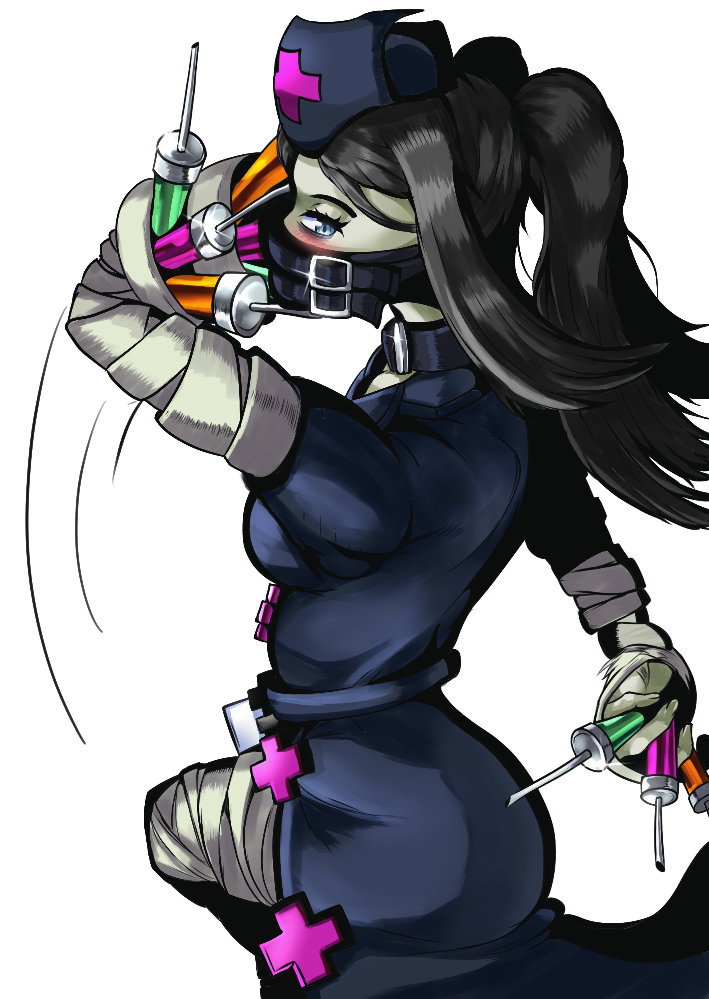 bandages belt blue_eyes blush facing_away hallow_(skullgirls) hat nurse nurse_cap pale_skin reronozero skullgirls syringe tagme