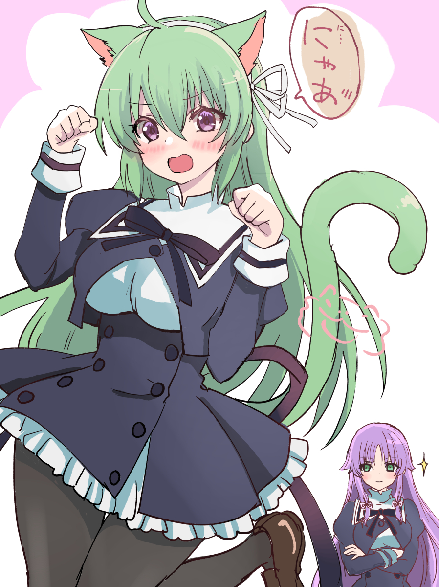 2girls animal_ears arms_under_breasts assault_lily banshouya_ena black_pantyhose black_ribbon black_skirt blush bow_hairband breasts brown_shoes buttons cat_ears cat_girl cat_tail closed_mouth commentary_request cowboy_shot cropped_jacket crossed_arms frilled_skirt frills green_eyes green_hair hair_between_eyes hair_ribbon hairband hands_up high-waist_skirt highres juliet_sleeves kemonomimi_mode leg_up loafers long_bangs long_hair long_sleeves looking_at_another looking_at_viewer low-tied_sidelocks medium_breasts miniskirt multiple_girls neck_ribbon open_mouth pantyhose paw_pose pink_background puffy_sleeves purple_eyes purple_hair ribbon school_uniform shoes sidelocks skirt smile sparkle speech_bubble spoken_blush standing standing_on_one_leg tail takesatotaroro tanaka_ichi translated two-tone_background v-shaped_eyebrows very_long_hair white_background white_hairband white_ribbon yurigaoka_girls_academy_school_uniform