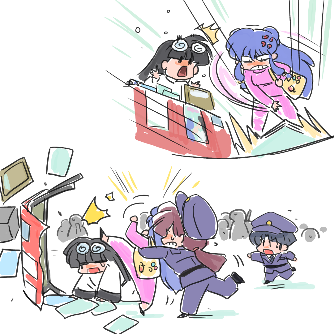 1boy 3girls anger_vein angry black_hair brown_hair chibi coke-bottle_glasses commentary_request crowd double_bun eyewear_on_head glasses hair_bun hat kuonji_ukyou long_hair mousse_(ranma_1/2) multiple_girls pants pink_pants pink_shirt police police_uniform policewoman ponytail purple_hair ranma_1/2 shampoo_(ranma_1/2) shirt table table_flip tendou_akane wanta_(futoshi)