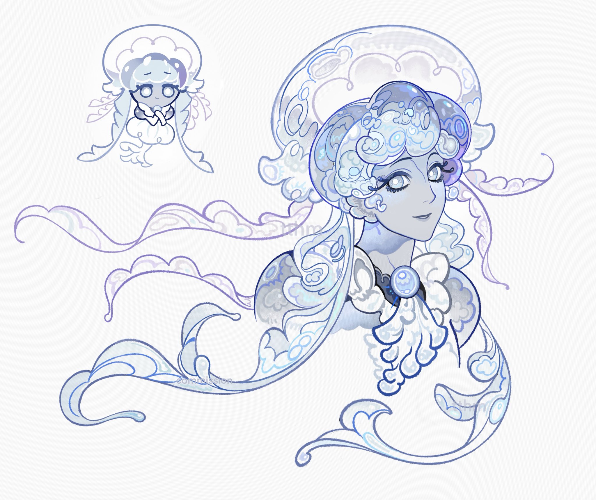 1girl cookie_run dress grey_dress grey_eyes hat highres jellyfish jellyfish_girl karsin2022 long_hair looking_at_viewer smile solo