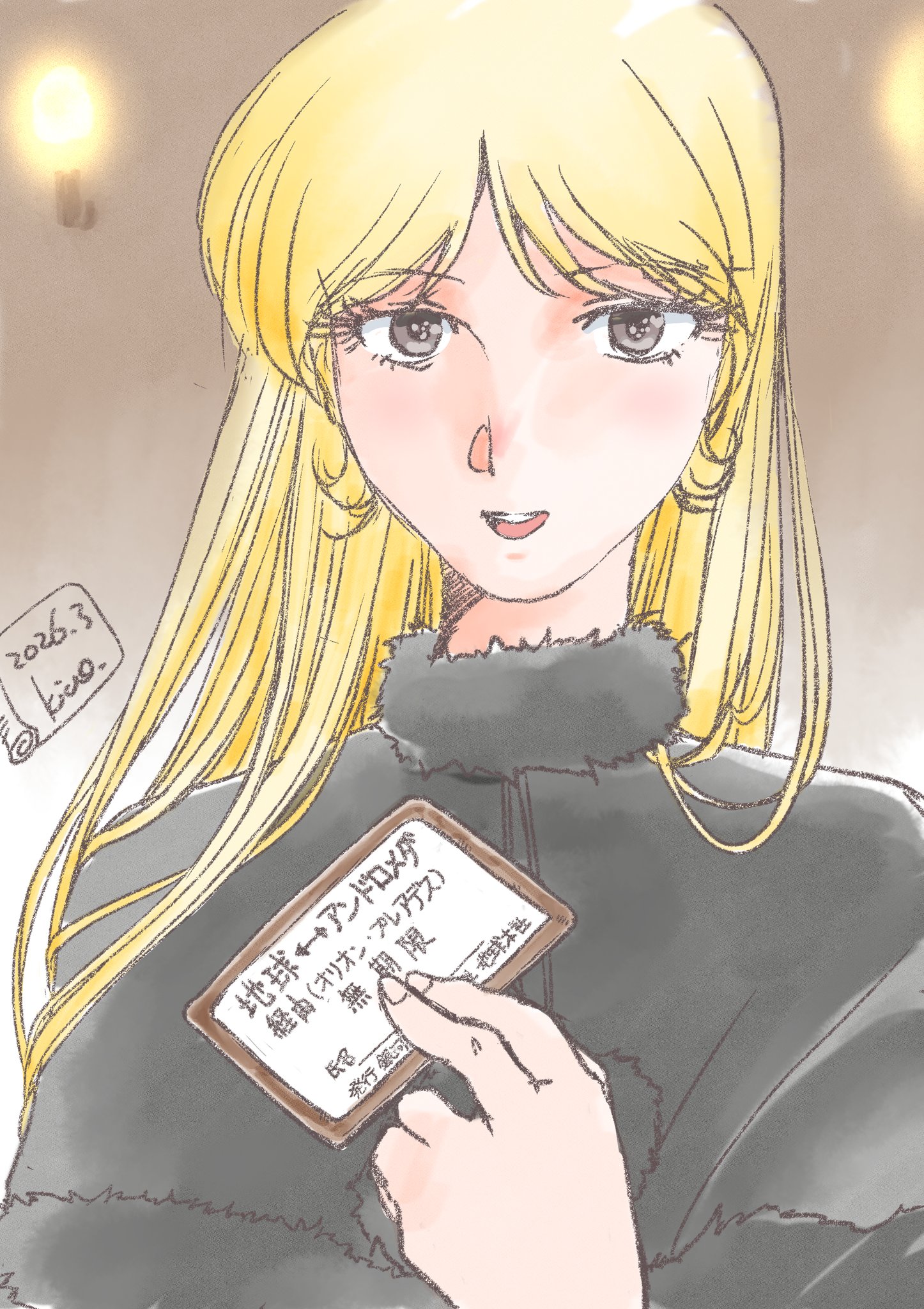 1girl 2026 arms_up black_capelet black_dress blonde_hair blush capelet drawstring dress eyelashes ginga_tetsudou_999 grey_hair hair_over_shoulder highres holding holding_ticket hoshino_tetsurou ikeda_masako kico_factory lamp long_eyelashes long_hair maetel missing_headwear open_mouth passport pom_pom_(clothes) simple_background sweater teeth ticket tongue translation_request turtleneck turtleneck_sweater upper_teeth_only very_long_hair
