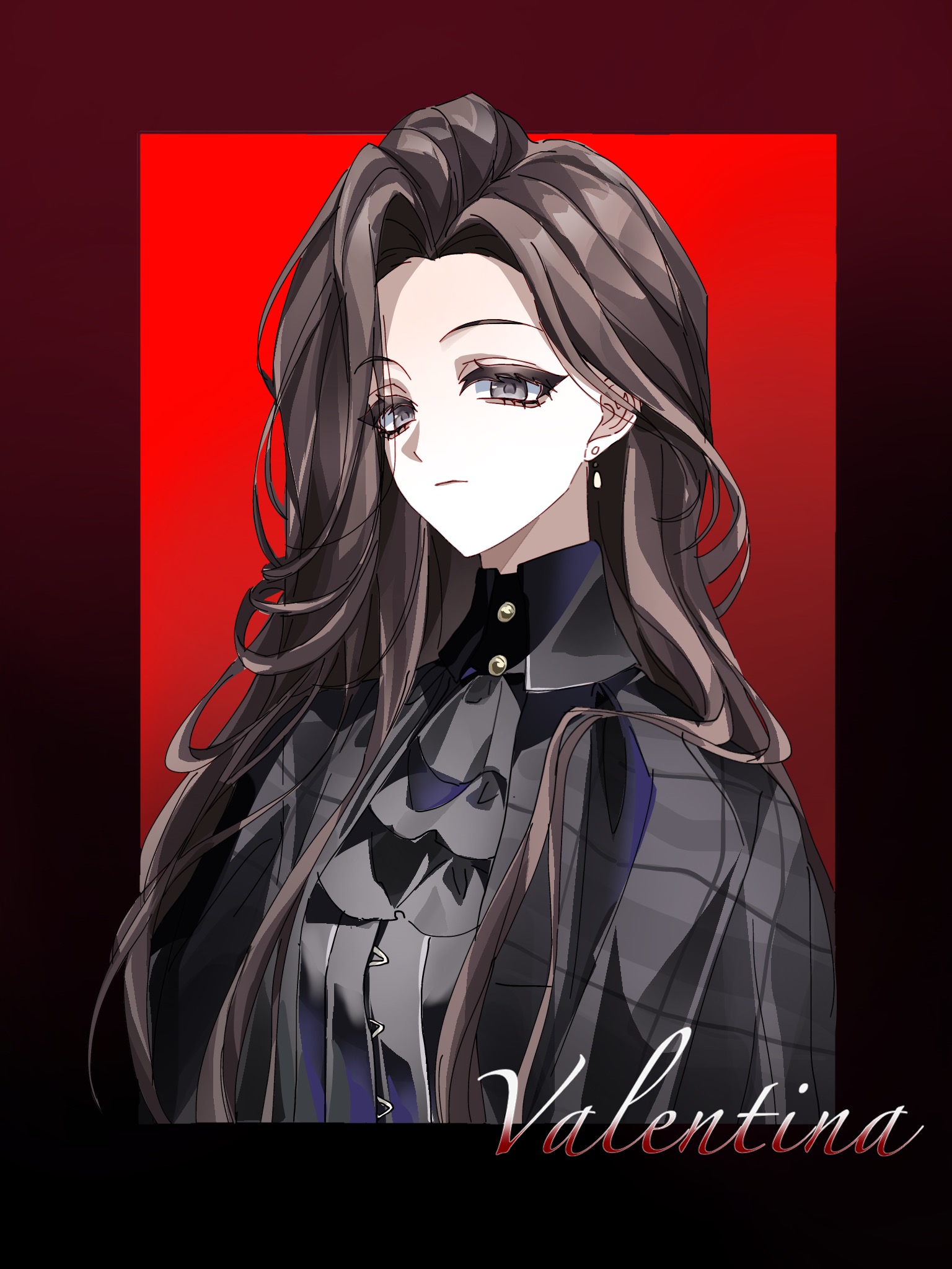 1girl aegyo_sal ascot black_ascot black_border black_cape black_shirt border brown_eyes brown_hair cape character_name chinese_commentary closed_mouth collared_shirt commentary_request earrings highres jewelry long_hair looking_at_viewer qingniao-baige red_background reverse:1999 shirt solo upper_body valentina_(reverse:1999)