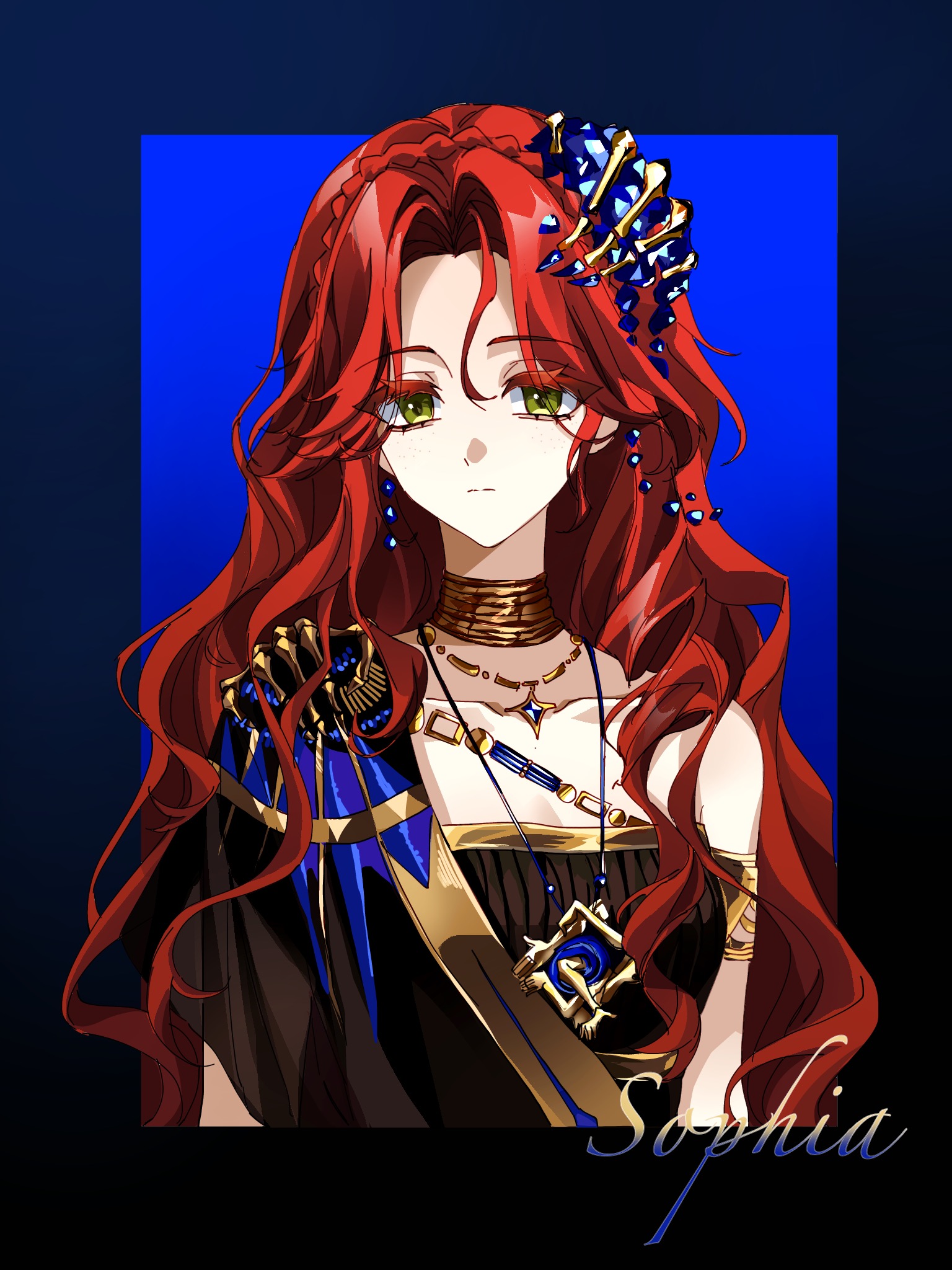 1girl aegyo_sal armlet black_border black_dress blue_background blue_gem border character_name chinese_commentary closed_mouth commentary_request dress expressionless gem gold_choker green_eyes hair_ornament highres jewelry long_hair looking_at_viewer pendant qingniao-baige red_hair reverse:1999 single_bare_shoulder single_off_shoulder solo sophia_(manus_vindictae)_(reverse:1999) sophia_(reverse:1999) upper_body