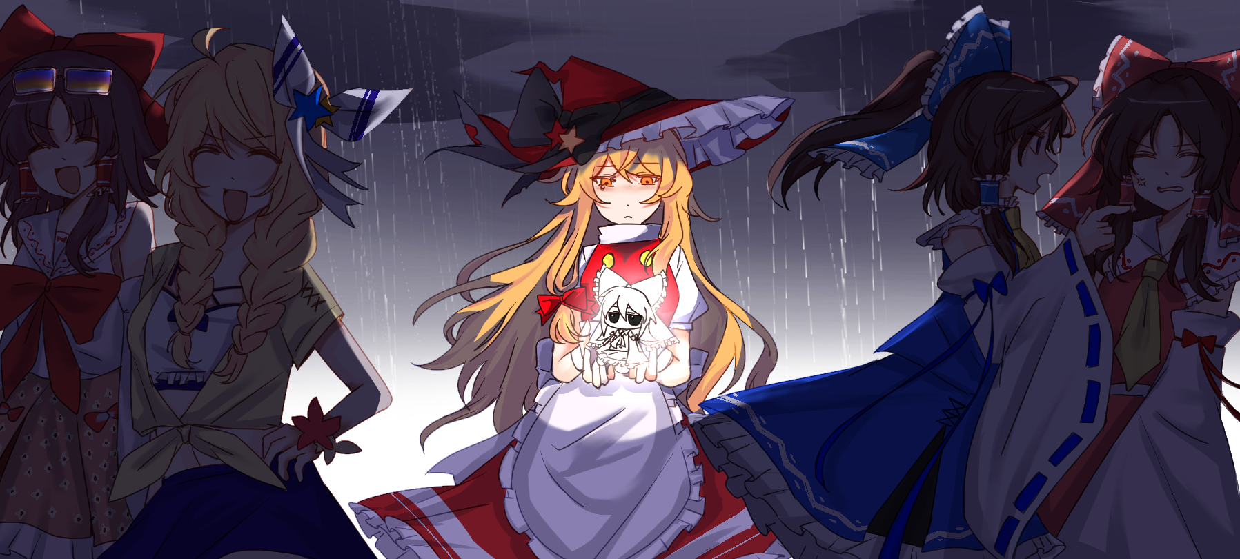 5girls adapted_costume alternate_color alternate_costume anger_vein angry apron artist_request ascot back_bow bikini bikini_skirt black_bow blonde_hair blue_bow blue_skirt bow bowtie bracelet brown_hair chinese_commentary closed_eyes commentary_request commission detached_sleeves eyewear_on_head facing_viewer flower_bracelet frilled_bow frilled_hair_tubes frills hair_bow hair_tubes hakurei_reimu hakurei_reimu_(god-summoning_shaman) hakurei_reimu_(leisurely_shrine_maiden_of_paradise) hat hat_bow hat_ornament highres jewelry kirisame_marisa kirisame_marisa_(witch_of_scarlet_dreams) long_hair multiple_girls open_mouth orange_eyes partial_commentary pink_skirt rain red_bow red_bowtie red_hat red_skirt red_vest ribbon-trimmed_sleeves ribbon_trim second-party_source shirt skirt skirt_set smile star_(symbol) star_hat_ornament swimsuit tied_shirt touhou touhou_lostword very_long_hair vest white_apron white_bikini white_bow yellow_ascot yellow_shirt