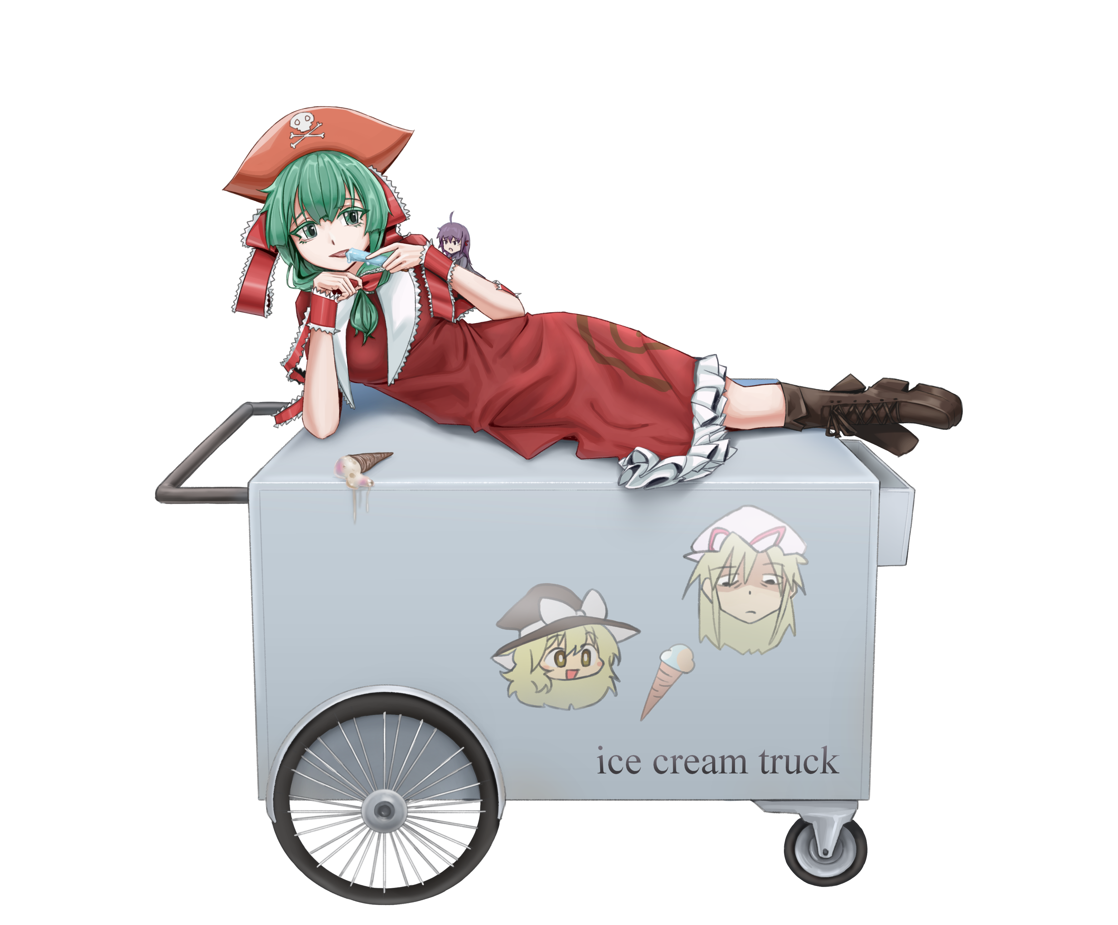 2girls absurdres boots brown_boots chibi commission commissioner_upload cookie_(touhou) dress food food_truck frilled_dress frills green_eyes green_hair hat higashi_aisu highres holding holding_food ice_cream kagiyama_hina kirisame_marisa licking multiple_girls nari-14 non-web_source pirate_hat red_dress smile sunglasses touhou voice_actor_connection white_background yakumo_yukari