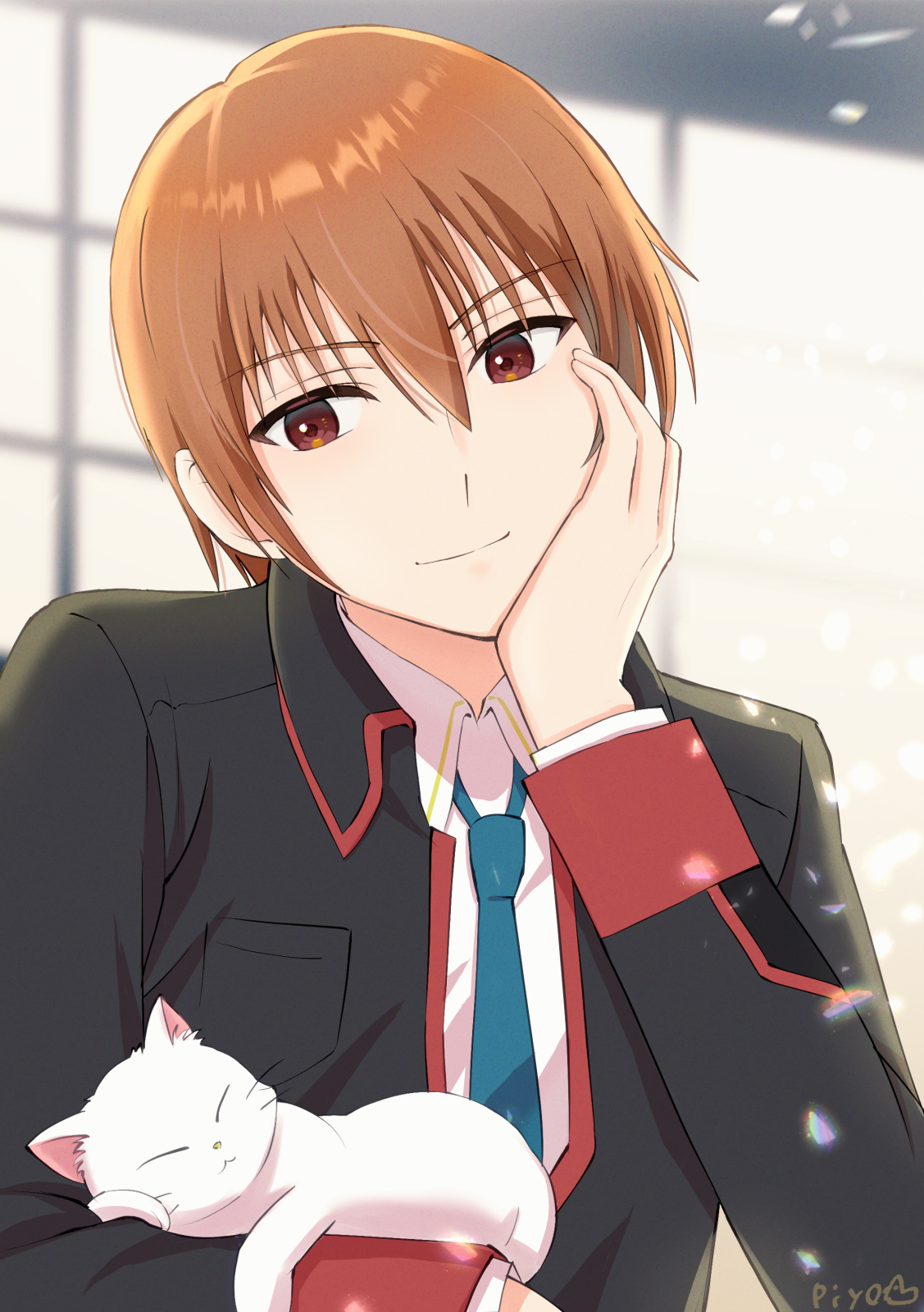 1boy animal backlighting black_jacket blue_necktie brown_eyes brown_hair cat closed_mouth collared_shirt commentary hair_between_eyes hand_on_own_cheek hand_on_own_face head_tilt highres holding holding_animal holding_cat jacket lennon_(little_busters!) light_particles little_busters! little_busters!_school_uniform long_sleeves looking_at_animal looking_down male_focus natsume_kyousuke necktie piyo_(kinkooo333) school_uniform shirt short_hair signature sleeping smile solo tsurime upper_body white_cat white_shirt