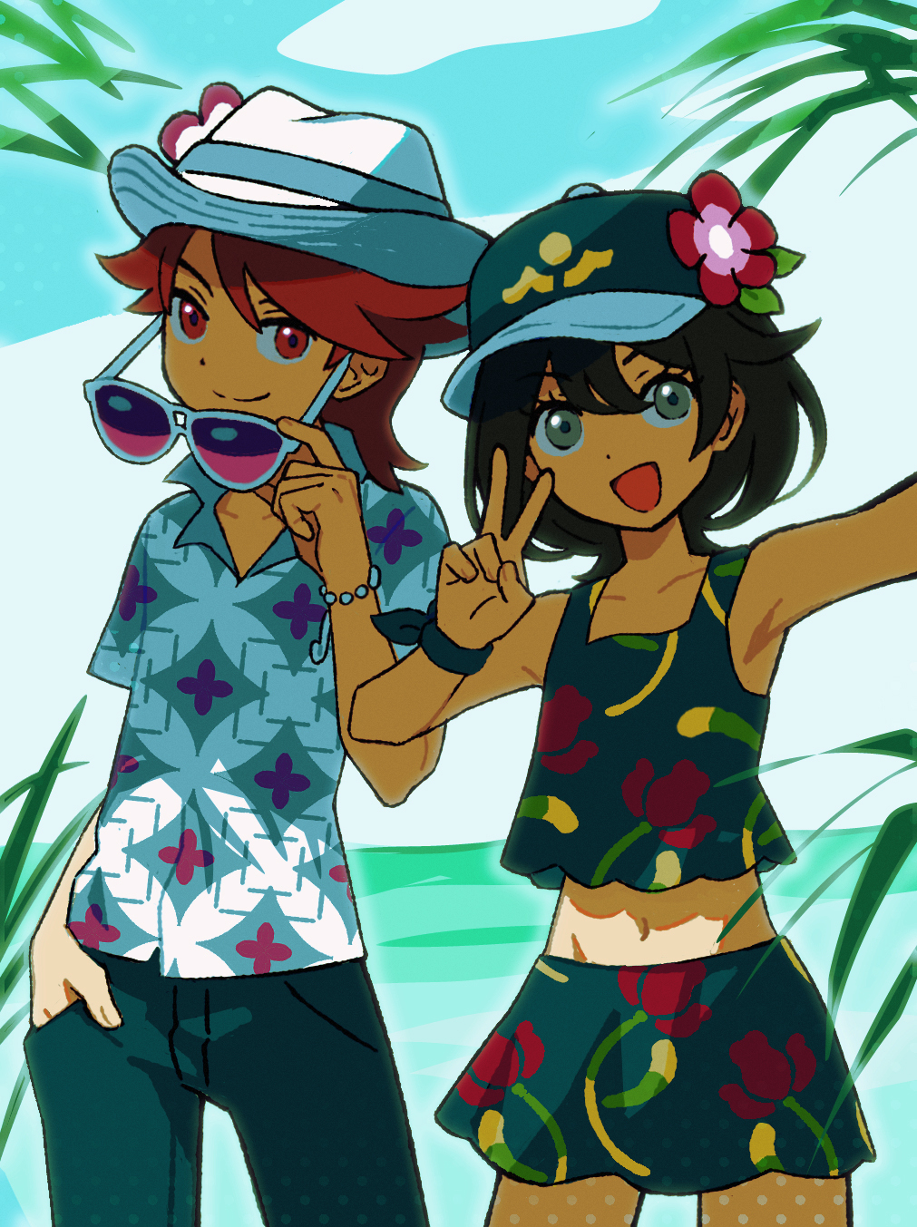 1boy 1girl :d alternate_costume baseball_cap black_hair blue_hat blue_shirt blue_sky blue_tank_top bracelet brown_eyes brown_hair cloud commentary cosplay crop_top english_commentary fedora female_protagonist_(pokemon_ww) floral_print floral_print_shirt floral_print_skirt flower gen_1_pokemon grey_eyes hand_in_pocket hat hat_flower highres holding holding_removed_eyewear jewelry leaf male_protagonist_(pokemon_ww) mr._windychu mr._windychu_(cosplay) ms._wavychu ms._wavychu_(cosplay) multicolored_shirt navel nintendo ocean open_mouth pants pikachu pink-tinted_eyewear plasticflask pokemon pokemon_winds_and_waves polka_dot print_skirt shirt skirt sky smile sunglasses tank_top tinted_eyewear tropical unworn_eyewear v white_shirt wrist_bow wristband