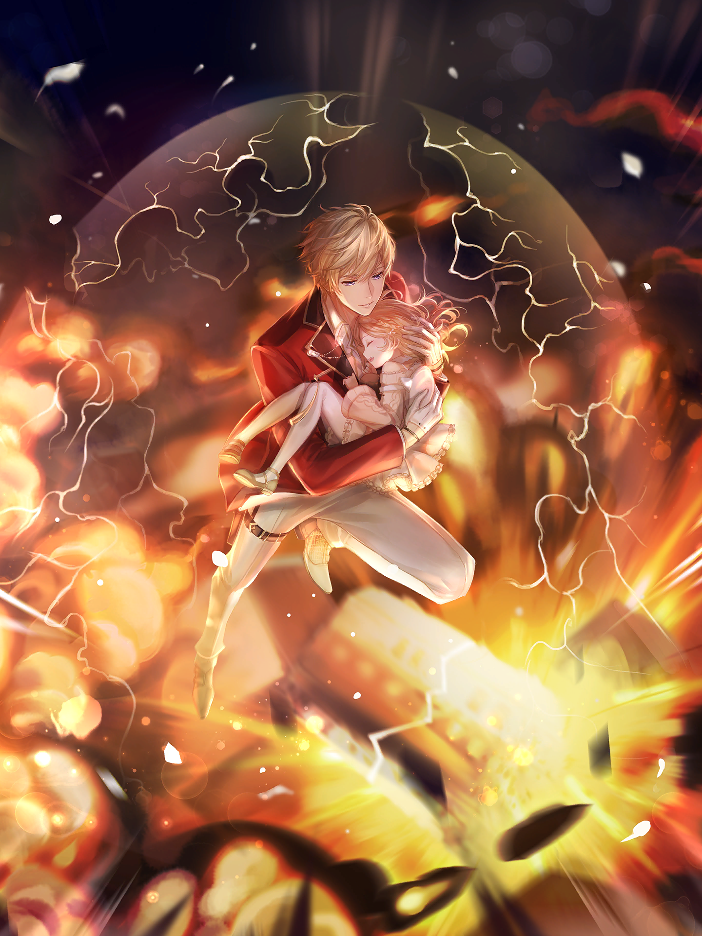 1boy 1girl artist_request bare_shoulders belt belt_buckle black_belt black_shoes blazer blonde_hair blue_eyes blue_sky buckle carrying closed_eyes closed_mouth collared_jacket contrast_collar determined dress suit_pants dress_shoes emphasis_lines explosion floating_hair frown full_body fur-trimmed_sleeves fur_trim game_cg gloves gold_buckle grey_shoes hair_between_eyes high_heels highres jacket jumping lapels layered_sleeves light_particles loen_(shining_nikki) long_sleeves looking_ahead medium_hair messy_hair military_uniform nikki_(series) notched_lapels off-shoulder_sweater off_shoulder official_art open_mouth outdoors pants pantyhose petals pink_sweater pointy_nose princess_carry pumps red_jacket rescue scared shining_nikki shoes short_hair sky smoke sunset susan_(shining_nikki) sweater sweater_dress thigh_belt thigh_strap third-party_source train white_gloves white_pants white_pantyhose