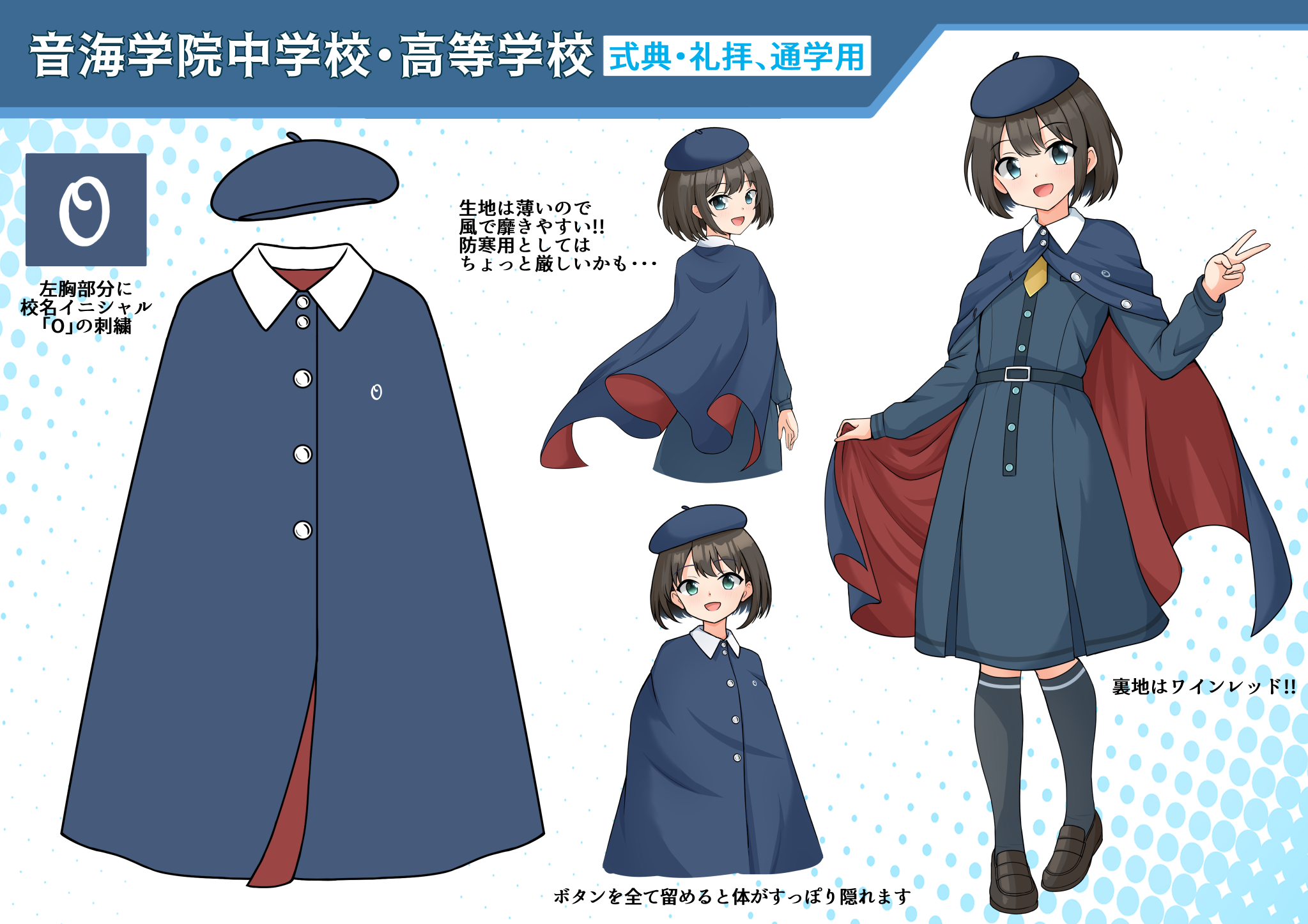 1girl beret black_socks blue_dress blue_skirt bob_cut cloak commentary_request dress green_eyes hat highres kneehighs kuroketo loafers necktie original reference_sheet sailor_collar school_uniform shoes short_hair simple_background skirt socks victory_pose windbreaker winter_clothes winter_uniform yellow_necktie