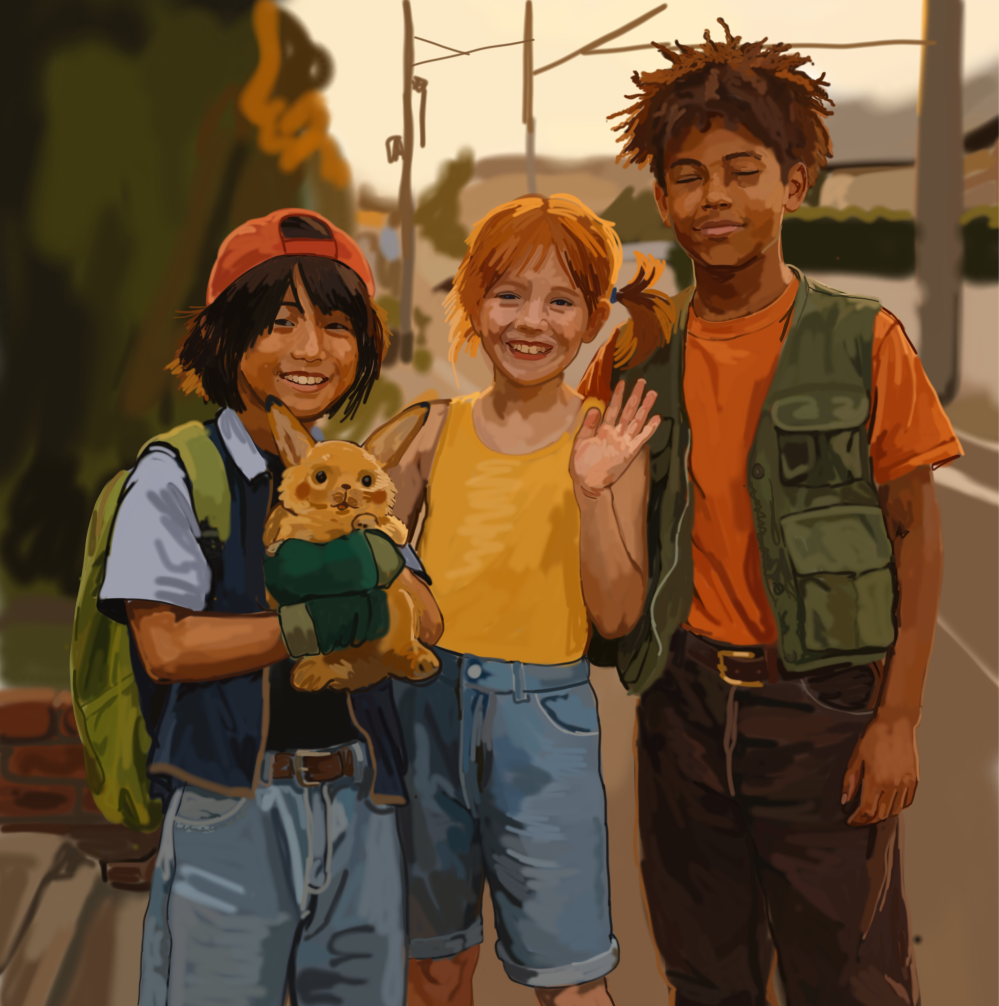 1girl 2boys aegyo_sal animal ash_ketchum backwards_hat belt black_hair black_shirt brock_(pokemon) brown_hair child closed_eyes closed_mouth commentary curly_hair dark-skinned_male dark_skin denim denim_shorts east_asian english_commentary gen_1_pokemon girlvasectomy gloves grin hat highres jeans lips looking_at_viewer misty_(pokemon) multiple_boys nintendo orange_hair orange_shirt outdoors painterly pants pikachu pocket pokemon pokemon_(anime) pokemon_(classic_anime) pokemon_(creature) realistic shirt short_hair shorts side_ponytail smile standing t-shirt tank_top teeth vest yellow_shirt