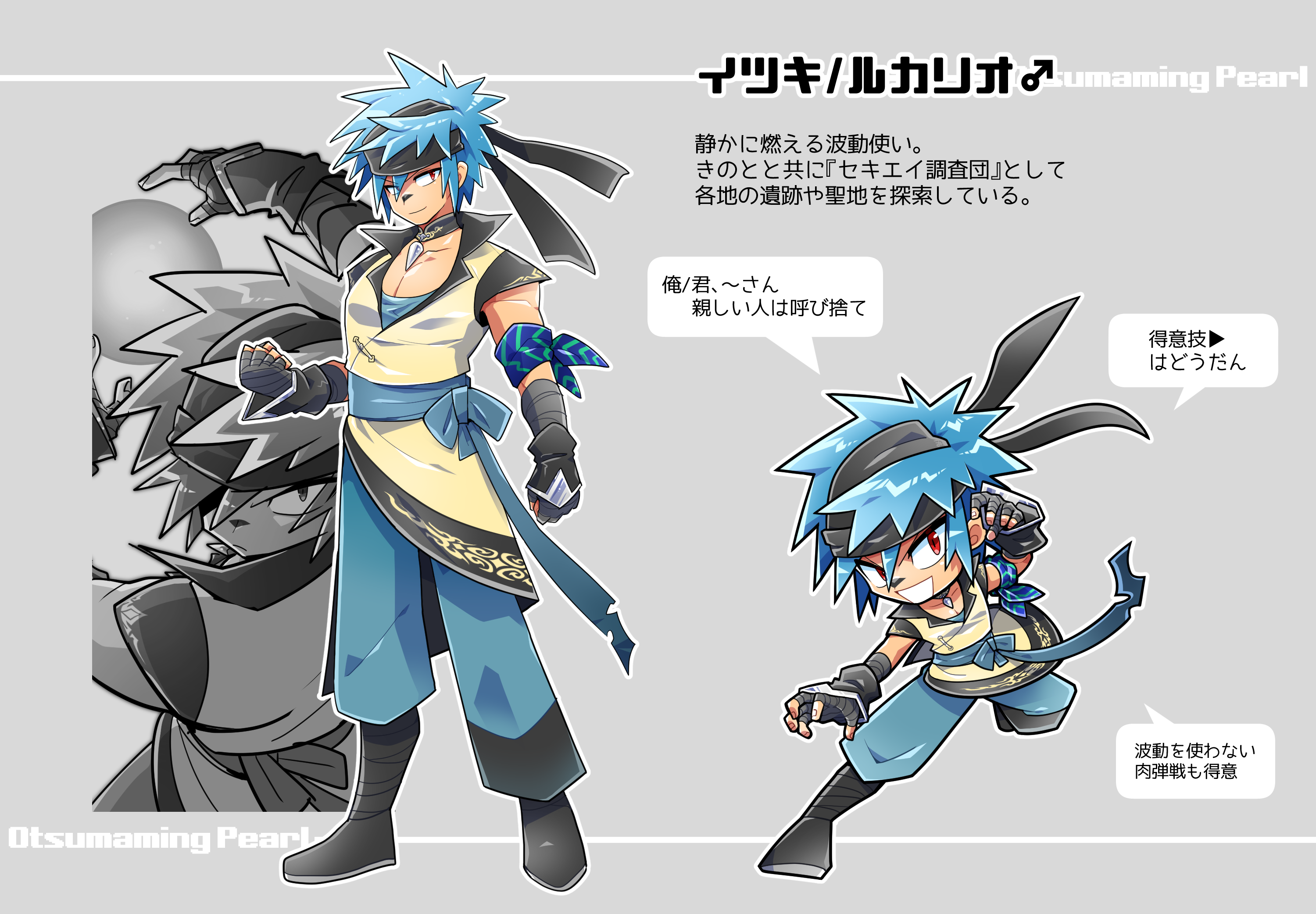 1boy asymmetrical_pants aura_sphere_(pokemon) bandana bandana_around_arm black_boots black_gloves black_headband blue_bandana blue_bow blue_hair blue_pants blue_sash blue_shirt boots bow character_name character_profile chibi choker clenched_hands commentary_request energy_ball facial_mark fingerless_gloves full_body gen_4_pokemon gloves grey_background grey_choker headband highres lucario male_focus mars_symbol multiple_views nintendo open_mouth pants personification pokemon pokemon_move red_eyes sash serious shirt short_hair smile speech_bubble spiked_hair standing surume17 translation_request tunic white_tunic