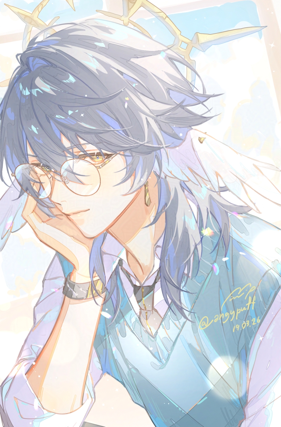 &{ID:13689932 CreatedAt:Thu Mar 19 23:30:32 -0500 2026 Score:1 Width:921 Height:1397 MD5:2654a68c179dc4333c7893b6dbf8002a Directory:26/54 Image:2654a68c179dc4333c7893b6dbf8002a.jpg Rating:general Source:https://x.com/angypuff/status/2034578126114640251 Change:1773981032 Owner:danbooru CreatorID:6498 ParentID:0 Sample:0 PreviewHeight:350 PreviewWidth:230 Tags:1boy alternate_costume angypuff black_necktie blue_sweater_vest bracelet closed_mouth collared_shirt commentary halo halo_behind_head head_rest highres honkai:_star_rail honkai_(series) jewelry looking_to_the_side male_focus necktie open_collar rimless_eyewear round_eyewear shirt sideways_glance solo sunday_(honkai:_star_rail) sweater_vest white_shirt yellow_eyes Title: HasNotes:false HasComments:false FileURL:https://img2.gelbooru.com/images/26/54/2654a68c179dc4333c7893b6dbf8002a.jpg PreviewURL:https://gelbooru.com/thumbnails/26/54/thumbnail_2654a68c179dc4333c7893b6dbf8002a.jpg SampleURL: SampleHeight:0 SampleWidth:0 Status:active PostLocked:0 HasChildren:false IsVideo:false DisplayDate:19.03.2026 23:30}