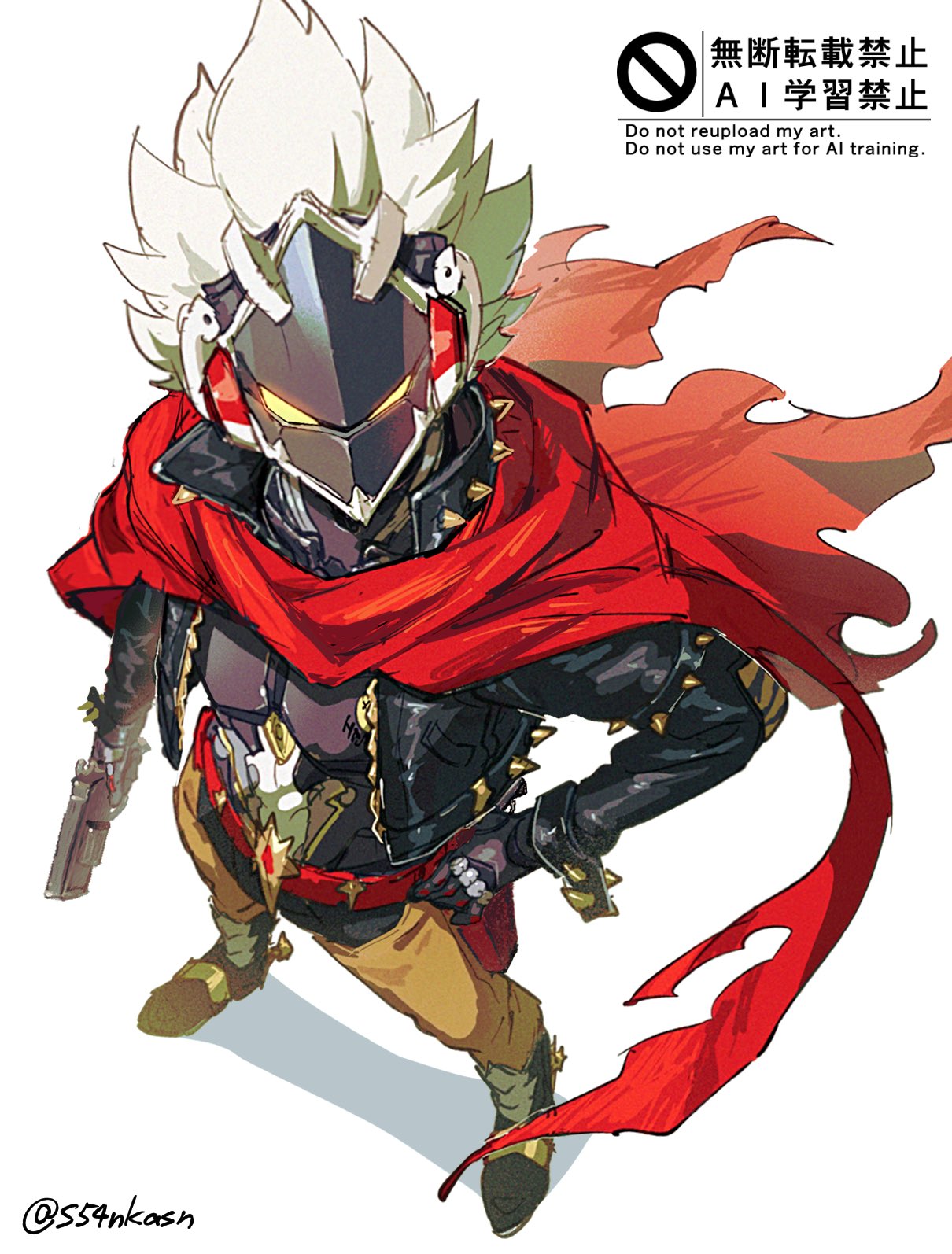 1boy belt billy_kid black_jacket brown_pants cloak commentary_request cyborg full_body gun hand_on_own_hip handgun highres holding holding_gun holding_weapon jacket long_sleeves male_focus open_clothes open_jacket pants popped_collar red_belt red_cloak s54nkasn short_hair solo spurs standing twitter_username watermark weapon white_background white_hair yellow_eyes zenless_zone_zero