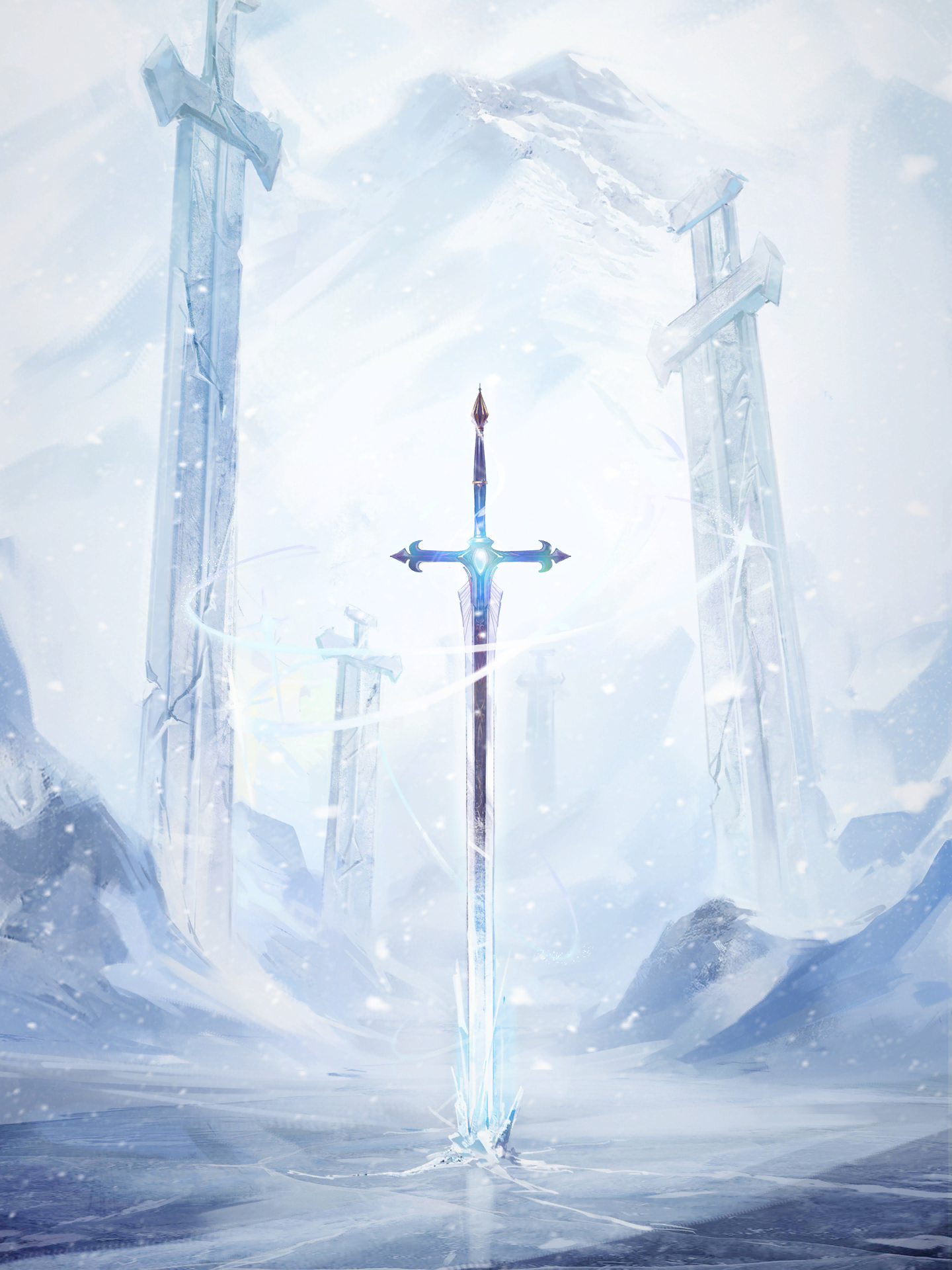 artist_request blue_gem crack day fog game_cg gem glowing_gem highres ice mountain nikki_(series) no_humans object_focus official_art outdoors ruins shining_nikki snow sword third-party_source weapon winter