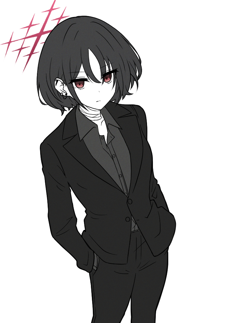 1girl bandaged_neck bandages blazer blue_archive cowboy_shot suit_pants dress_shirt ear_piercing expressionless formal_clothes generic_33 greyscale halo hands_in_pockets jacket long_sleeves looking_at_viewer misaki_(blue_archive) monochrome open_collar partially_unbuttoned piercing red_eyes red_halo shirt short_hair simple_background solo spot_color suit white_background