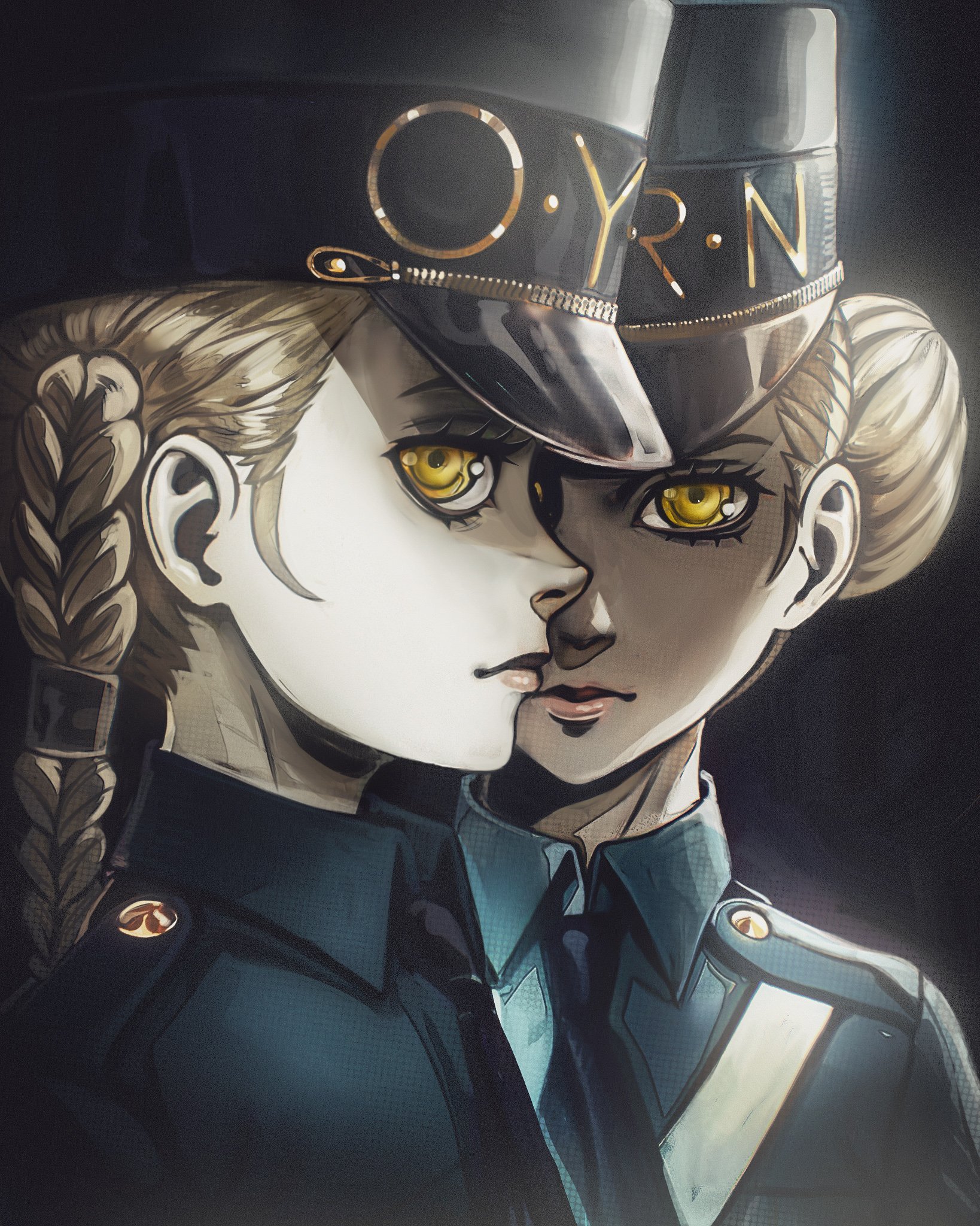 2girls black_background black_necktie blue_hat blue_shirt braid caroline_(persona_5) chapinor closed_mouth commentary expressionless grey_hair hair_bun hat highres justine_(persona_5) kepi looking_at_viewer military_hat multiple_girls muted_color necktie persona persona_5 portrait profile revision shirt siblings simple_background single_side_bun sisters twins wing_collar yellow_eyes