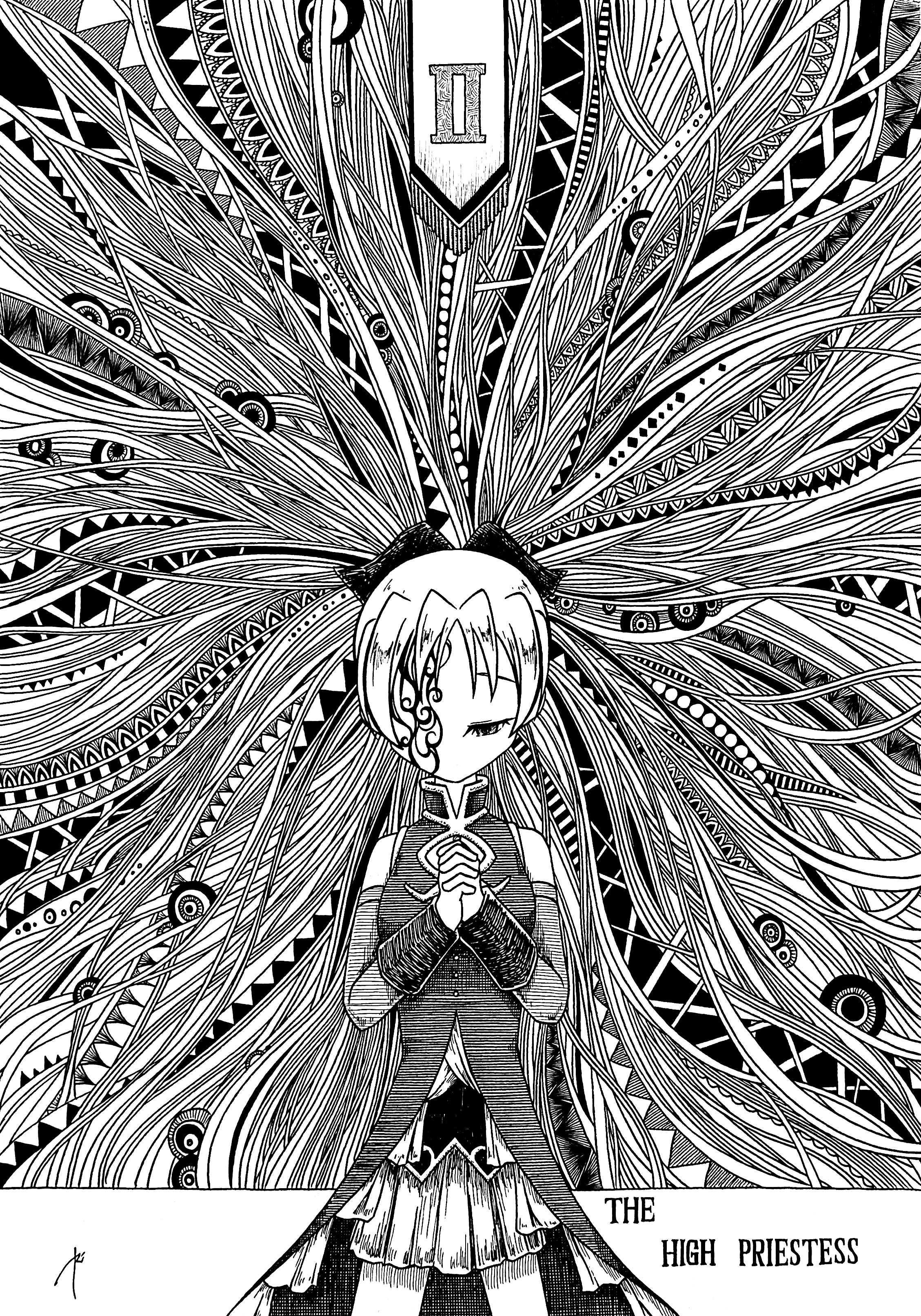 absurdres black_bow bow card_(medium) detached_sleeves dress frilled_dress frills greyscale hair_bow high_collar highres long_hair mahou_shoujo_madoka_magica monochrome one_eye_covered own_hands_together rigel0310 roman_numeral sakura_kyoko sakura_kyoko_(magical_girl) sleeveless sleeveless_dress tarot tarot_(medium) the_high_priestess_(tarot) very_long_hair