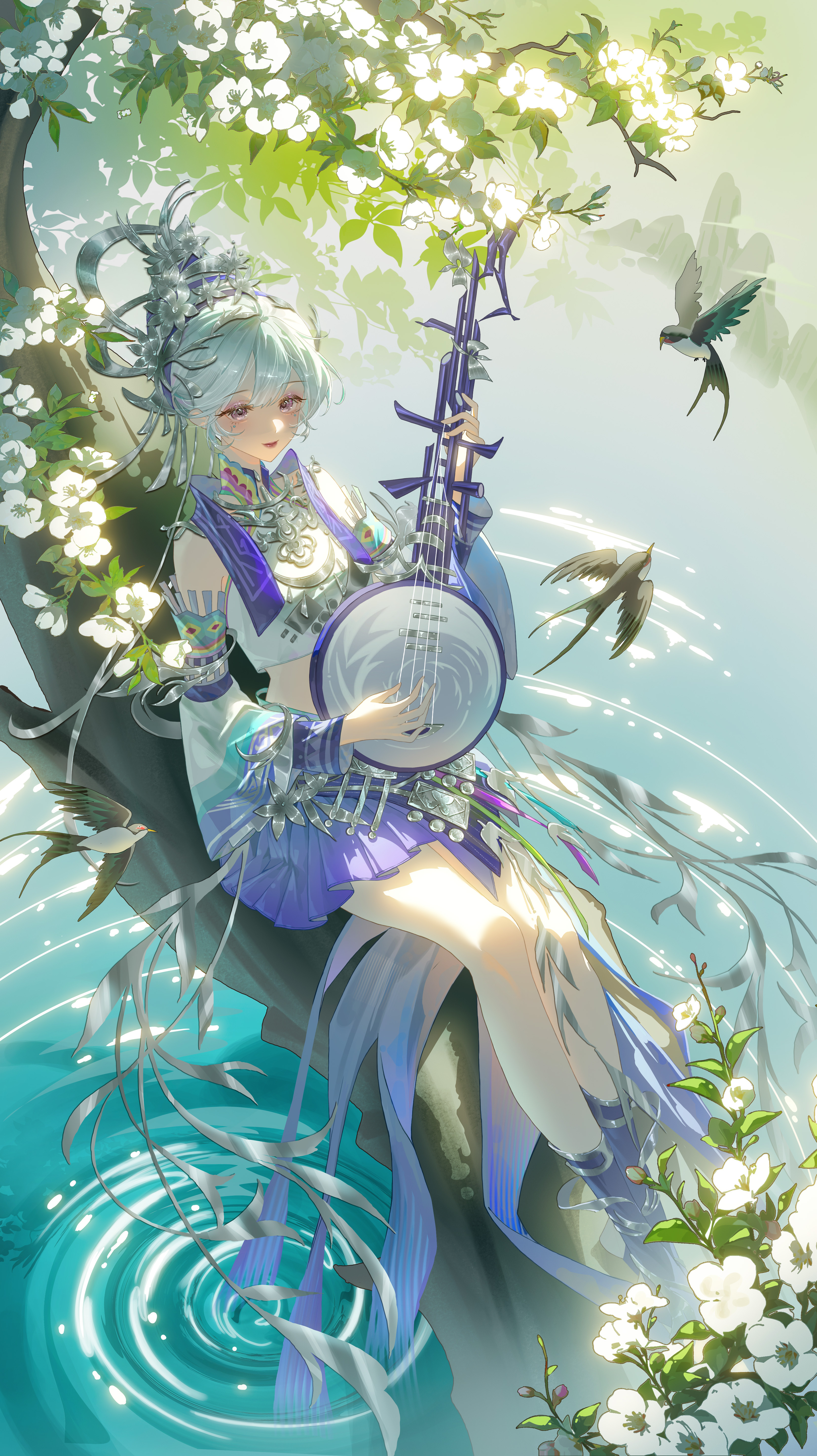 1girl absurdres bird brown_eyes chinese_commentary commentary_request daqiao_(wangzhe_rongyao) detached_sleeves dress flower fufudianxia full_body grey_hair hair_ornament harp highres holding holding_instrument instrument long_hair miao_clothes mountain music pear_blossoms playing_instrument ripples sitting skirt solo swallow_(bird) wangzhe_rongyao water white_flower white_hair