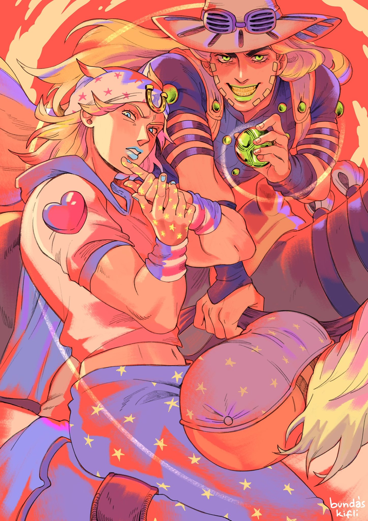 2boys arm_up arm_warmers armband artist_name ball beanie black_armband black_bridal_gauntlets black_shirt blonde_hair blue_eyes blue_lips blue_nails blue_pants blue_sleeves bridal_gauntlets brown_cape brown_hat bundaskiflii cape commentary english_commentary facial_hair goggles goggles_on_headwear gold_teeth golden_spiral green_eyes green_lips grills gyro_zeppeli hair_horns hat highres holding holding_ball holster hood hood_down hoodie horseback_riding horseshoe_hat_ornament horseshoe_ornament johnny_joestar jojo_no_kimyou_na_bouken jojo_pose long_hair looking_at_viewer makeup male_focus medium_hair multiple_boys pants parted_lips pointing riding shirt short_sleeves simple_background slow_dancer_(jojo) star_(symbol) star_print steel_ball_(jojo) steel_ball_run teeth toned toned_male two-tone_sleeves valkyrie_(jojo) white_background white_hat white_hoodie white_sleeves