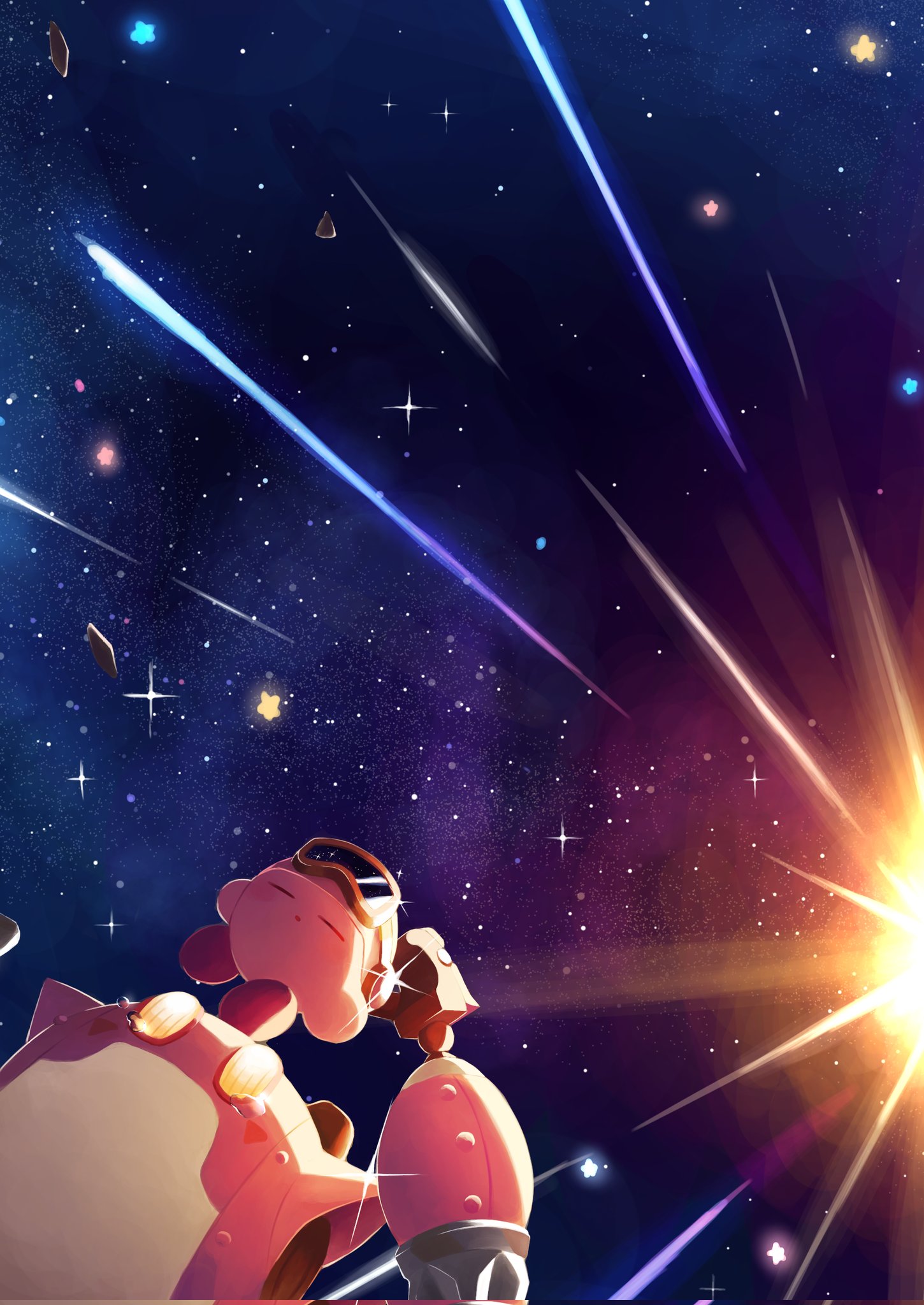 closed_eyes colored_skin debris goggles goggles_on_head highres kirby kirby:_planet_robobot kirby_(series) maguro_illust mechanical_arms nintendo pink_skin robobot_armor scene_reference space sparkle star_(sky) star_(symbol) tears