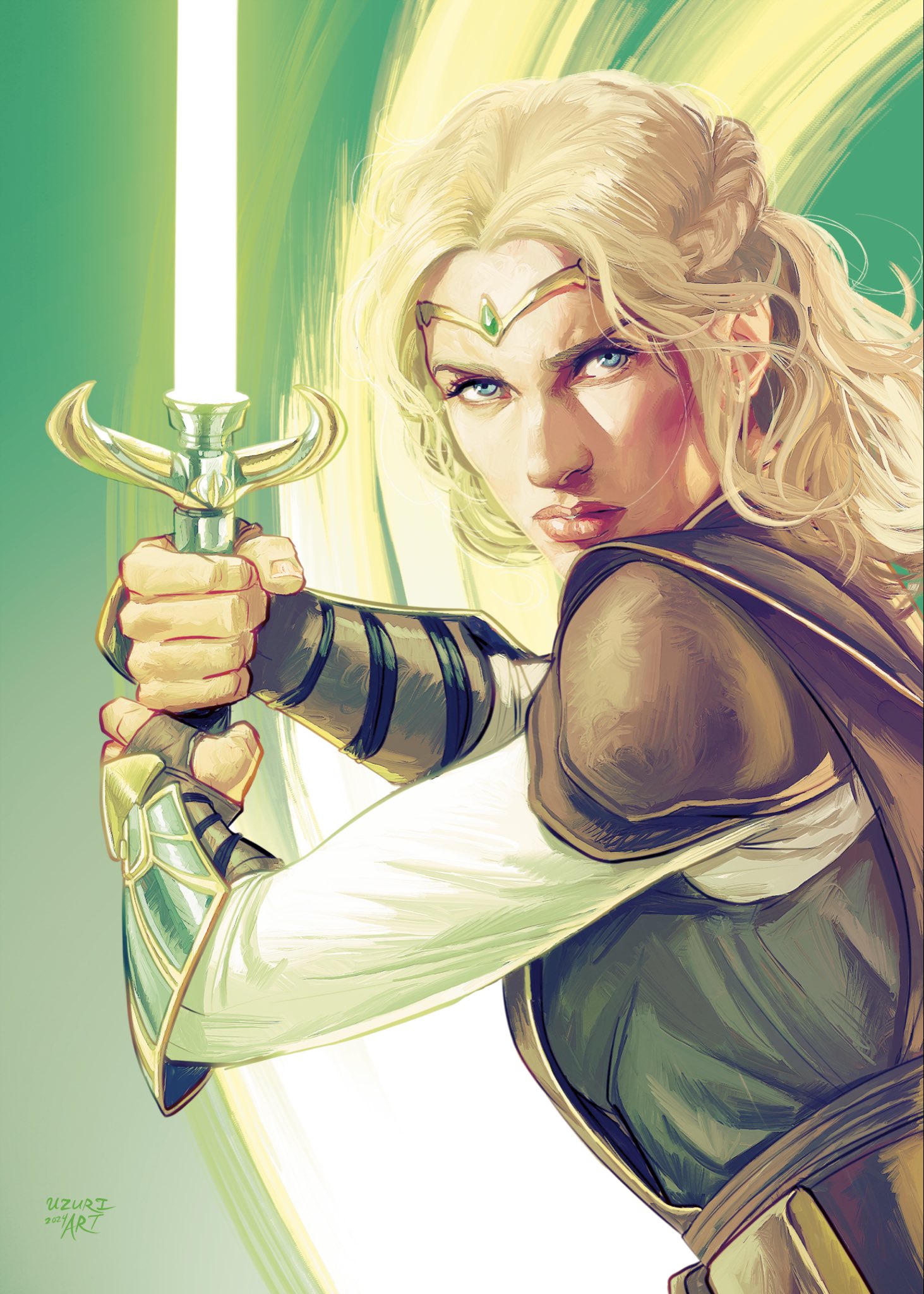 1girl armor avar_kriss blonde_hair blue_eyes bracer braid breasts brown_tunic cape circlet close-up closed_mouth dated energy_sword facing_viewer fighting_stance from_side gem green_gem green_lightsaber half_crown_braid hands_up highres holding holding_sword holding_weapon jedi lightsaber long_hair long_sleeves looking_at_viewer medium_breasts parted_bangs serious shirt shoulder_armor star_wars star_wars:_the_high_republic sword tunic uzuri_art wavy_hair weapon white_shirt