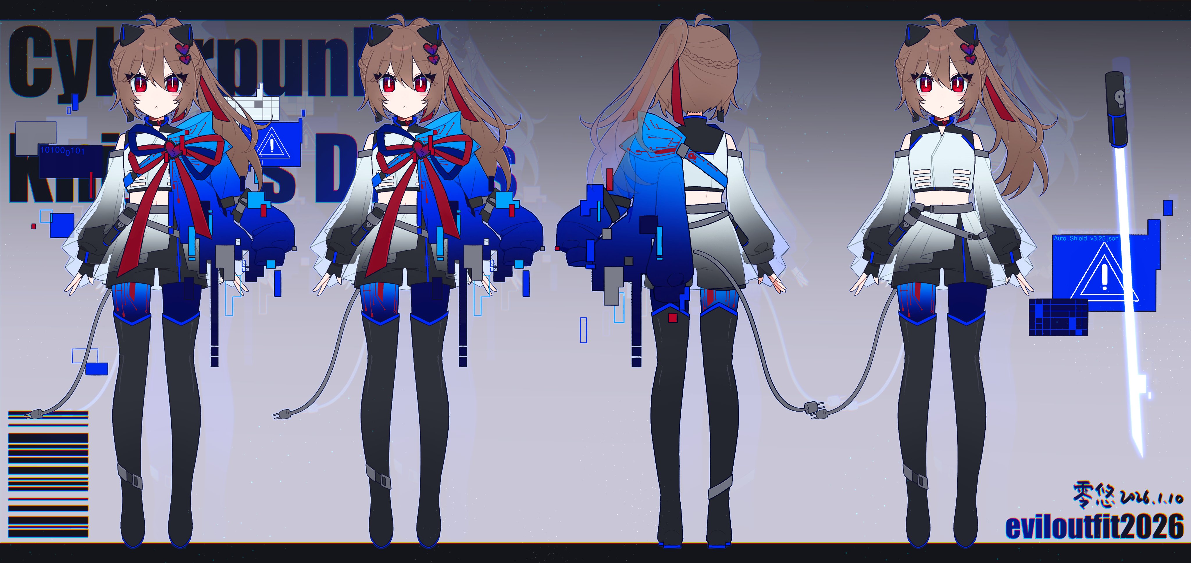 1girl :< absurdres ahoge alternate_costume alternate_hairstyle animal_ears arm_warmers asymmetrical_clothes barcode binary black_boots black_choker black_shorts blue_jacket boots bow braid broken_heart broken_heart_hair_ornament brown_hair cable cable_tail cat_ears cat_girl chest_strap choker circuit_board_print clothes_on_and_off crop_top dated drop_shadow energy_sword error_message evil_neuro-sama full_body glitch gradient_background gradient_clothes grey_arm_warmers grey_background grey_overskirt hair_between_eyes hair_ornament hair_ribbon hashtag heart heart_hair_ornament highres holster jacket letterboxed lingyou looking_at_viewer mechanical_ears mechanical_tail midriff multiple_views navel neuro-sama no_nose ponytail red_bow red_eyes red_ribbon ribbon robot_girl see-through_arm_warmers see-through_overskirt shorts side_ponytail sign single_braid skull standing sword tachi-e tail tank_top techwear thigh_boots turnaround vedal_ai warning_sign weapon white_tank_top