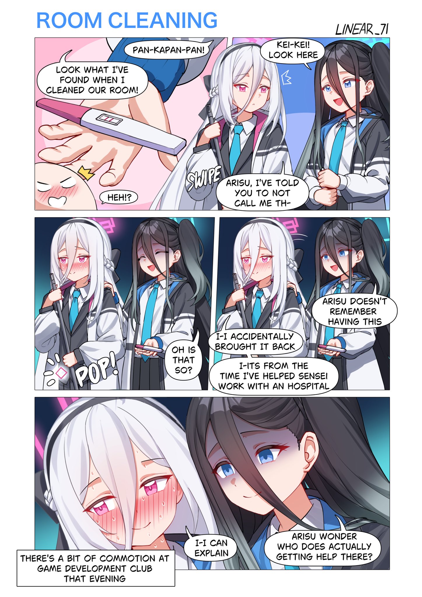 2girls absurdly_long_hair aris_(blue_archive) black_hair black_hairband blue_archive blue_halo blue_necktie commentary double-parted_bangs english_commentary english_text false_smile hair_between_eyes hairband halo highres holding holding_pregnancy_test jacket kei_(blue_archive) kei_(new_body)_(blue_archive) linear_71 long_hair long_hair_between_eyes looking_to_the_side multicolored_jacket multiple_girls necktie one_side_up pink_eyes pink_halo pregnancy_halo pregnancy_test rectangular_halo ringed_eyes shaded_face smile sweat two-tone_jacket very_long_hair white_hair white_jacket