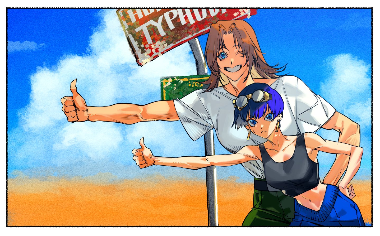 2girls black_hair brown_hair commentary_request goggles korean_commentary long_hair meryl_stryfe milly_thompson multiple_girls outdoors ra_raa14 road road_sign short_hair sign tall_female trigun trigun_stargaze