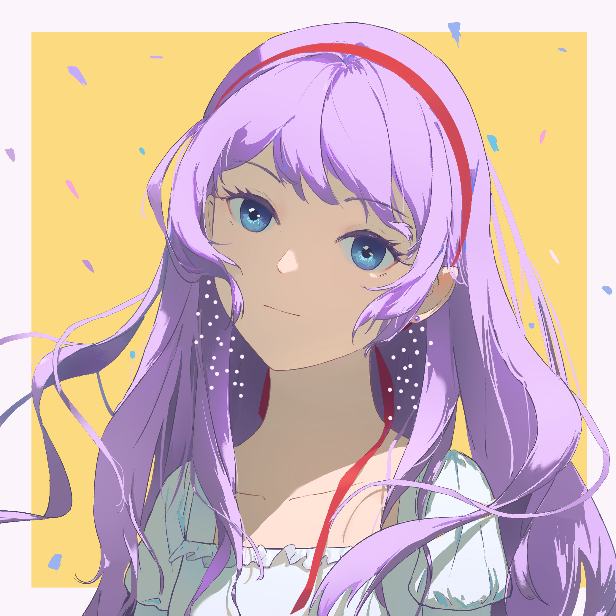 1girl :| blue_eyes border chinese_commentary closed_mouth commentary_request hairband head_tilt highres long_hair looking_at_viewer original outside_border purple_hair red_hairband shirt simple_background solo square_neckline upper_body white_border white_shirt yellow_background youfengtian
