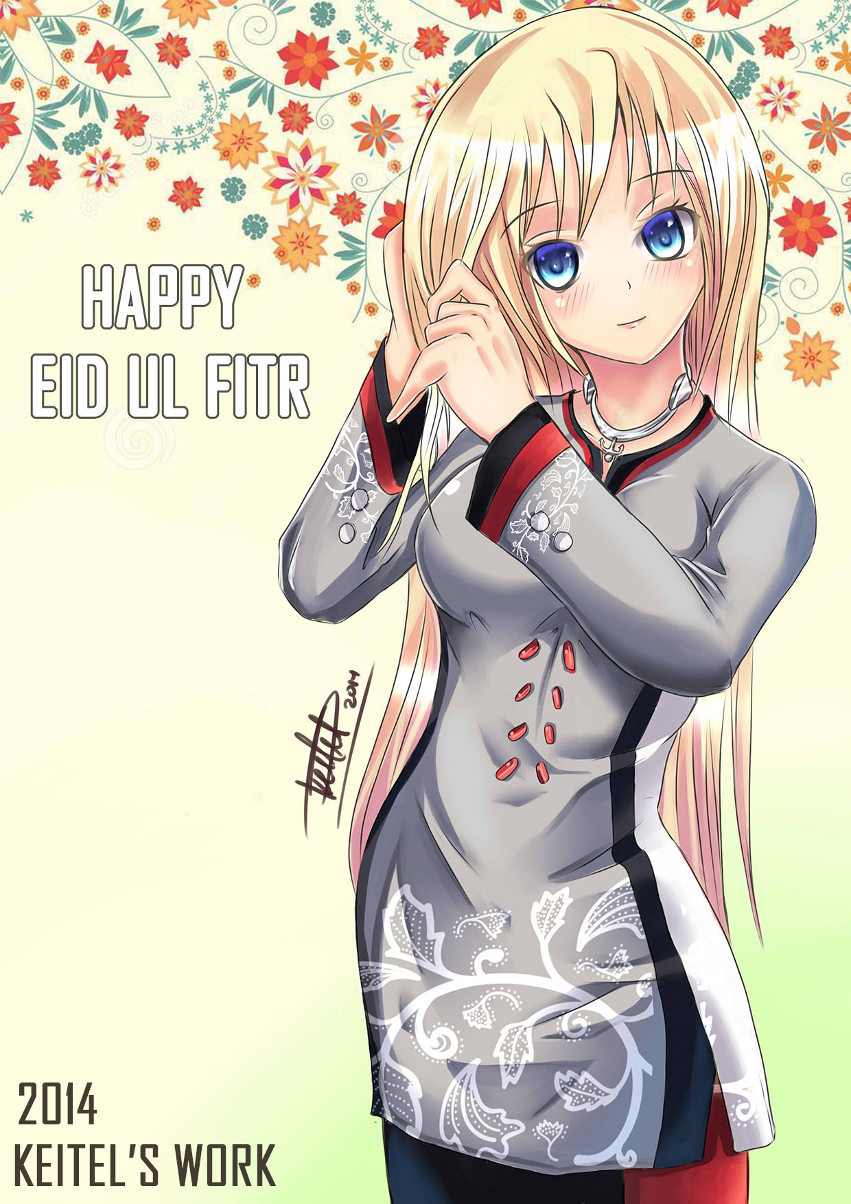 1girl 2014 adjusting_hair anchor anchor_necklace artist_name bismarck_(kancolle) black_trim blonde_hair blue_eyes blush breasts buttons closed_mouth commentary cowboy_shot dress eid_mubarak english_commentary english_text floral_background floral_print flower gradient_background green_background grey_dress highres jewelry kantai_collection keitel_von_birsk large_breasts light_smile long_hair long_sleeves looking_at_viewer mixed-language_commentary necklace orange_flower red_flower red_trim signature solo upper_body yellow_background